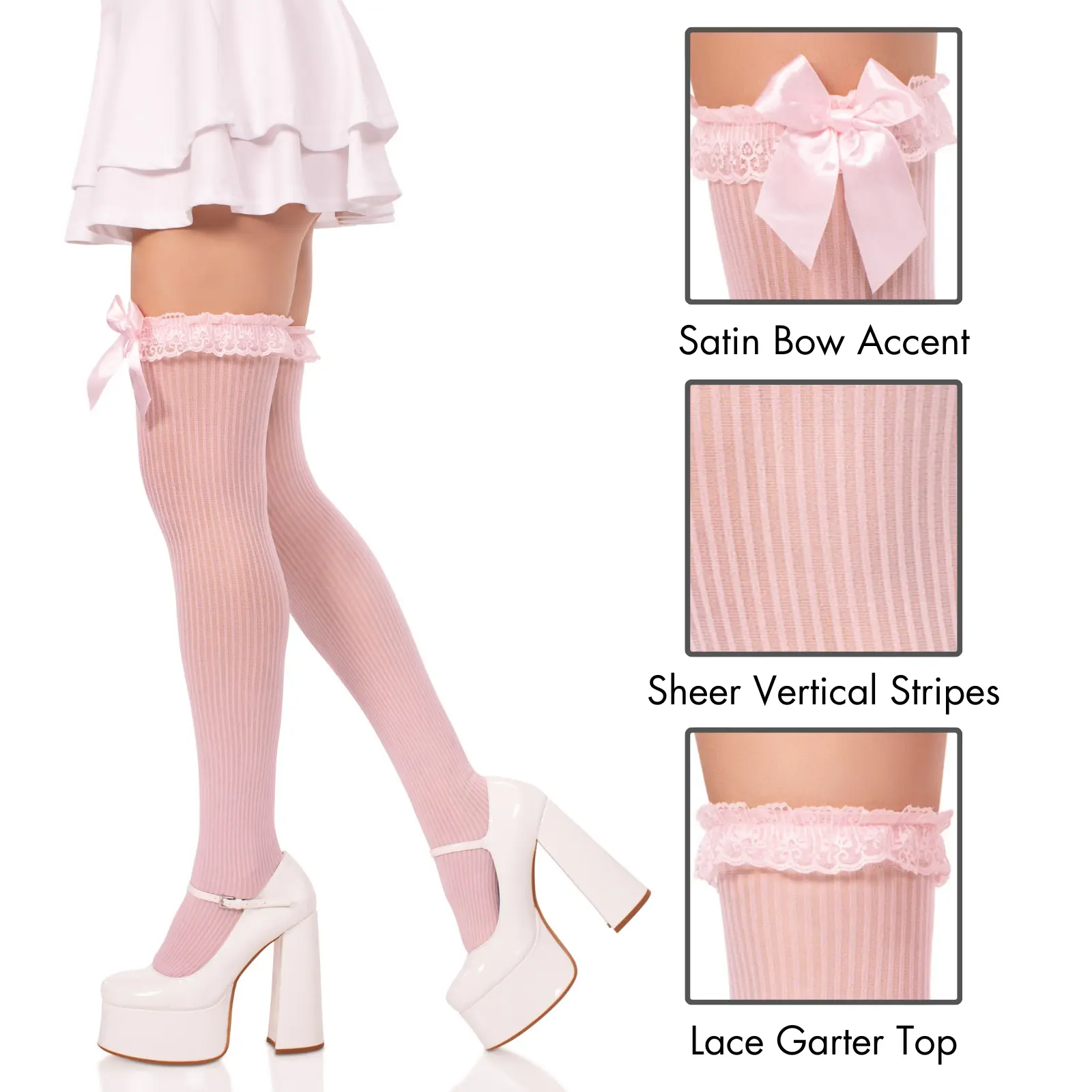 5. Leg Avenue Calliope Striped Knit Thigh Highs with Ruffle and Bow Cuff for Women Sheer Breathable Feminine Wear