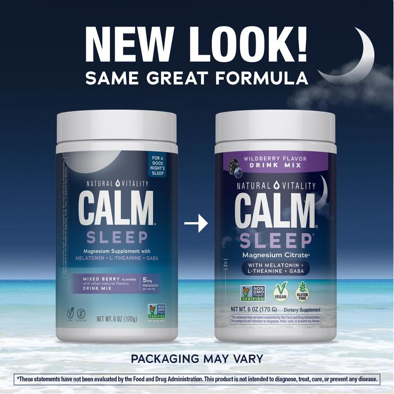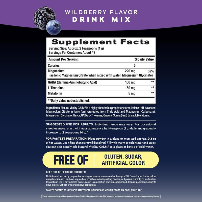 Natural Vitality CALM Sleep Drink Mix combines two amino acids, L-theanine and GABA, magnesium, and melatonin to support your natural cycle, and help you enjoy your best lifestyle.* Vegan and with a delicious wildberry flavor, it’s a nighttime beverage you’ll look forward to. Just pour, fizz, mix, and drink — and enjoy a soothing ritual before bed to support occasional sleeplessness.*
