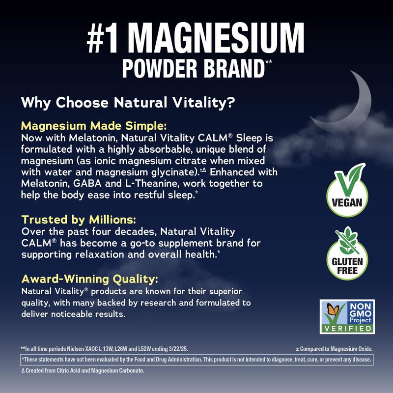 When the day settles but your mind won’t, find your calm with Natural Vitality CALM Sleep Drink Mix.* This soothing blend is perfect for those nights when you need extra sleep support.* Each serving of Natural Vitality CALM Sleep drink mix delivers 220 mg of magnesium as highly absorbable ionic magnesium citrate△ and glycinate, combined with 100 mg of GABA (Gamma Aminobutyric Acid), 50 mg of L-Theanine, and 5 mg of Melatonin, working together to help ease the body into restful sleep.†*