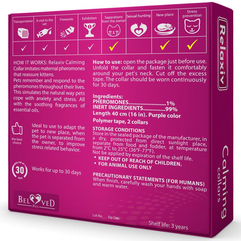 Wear the Relaxivet calming collar 24/7 for continuous support. Simply place it around your cat’s neck, and it provides on-the-go calming whether indoors or outdoors. Noticeable improvements in scratching and urine marking appear within 7 days. Replace the collar every 30 days to maintain its effectiveness, offering a convenient alternative to diffusers, sprays, and treats.