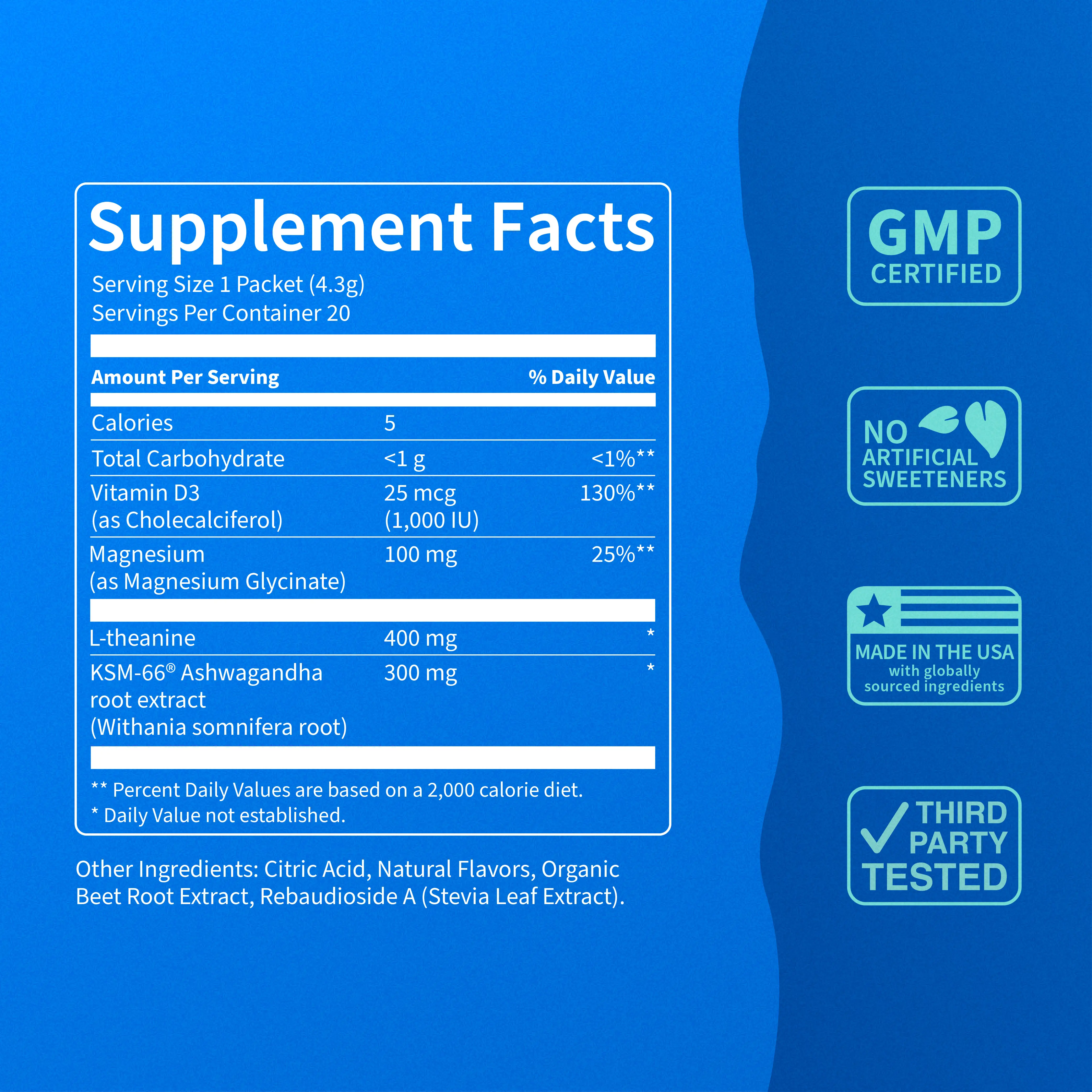 L-theanine. Magnesium. Ashwaghanda. And vitamin D3 which I lack extremely