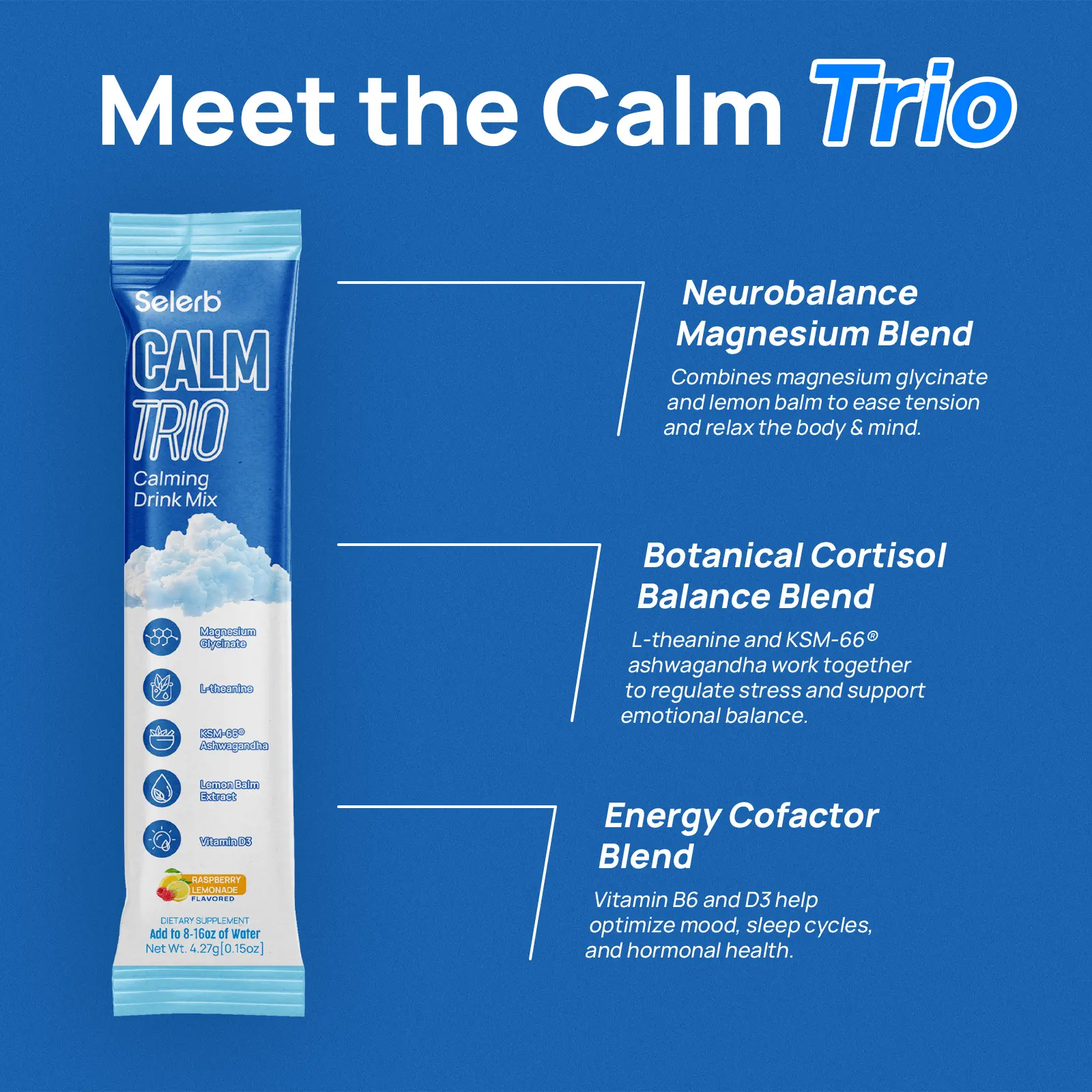 ·Cortisol Balance & Hormone Harmony: Formulated with KSM-66 Ashwagandha and L-Theanine, CalmTrio is a refreshing cortisol drink designed to support hormone balance, mood stability, and stress resilience — a science-backed cortisol supplement for women.