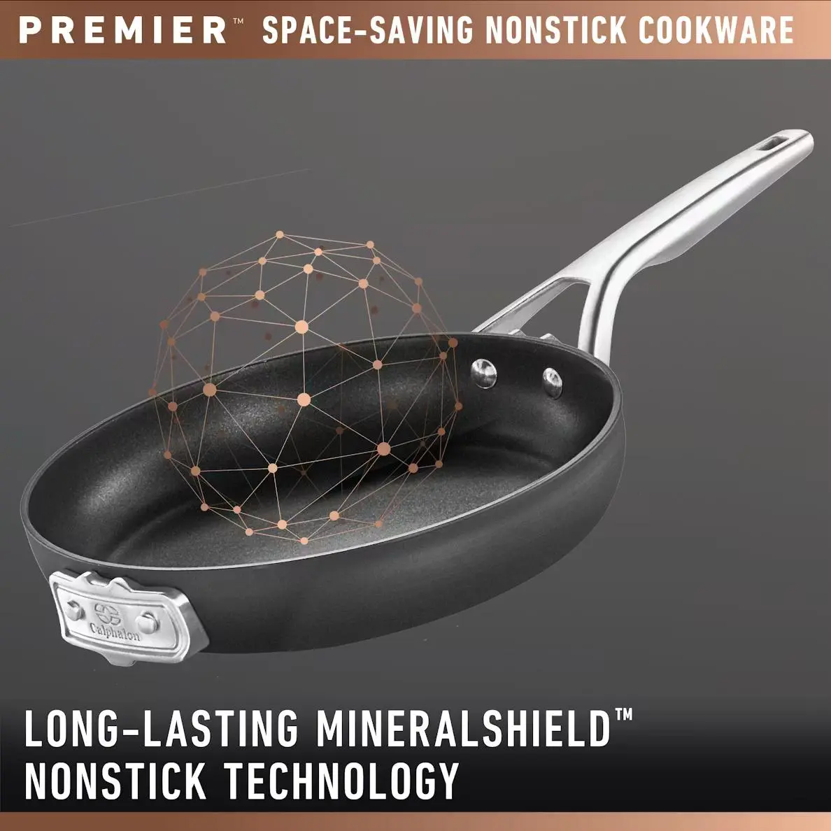 Featuring MineralShield nonstick technology, Calphalon Premier Space-Saving Hard-Anodized Nonstick Cookware is now 5x more durable than before when compared to the previous generation of Calphalon Classic. This nonstick everyday cooking pan delivers long-lasting performance for effortless food release, so you can cook with confidence and serve even the most delicate food with ease. This space-saving line also securely stacks to save 30% more space than its non-stacking counterparts. Thanks to their unique design and flat glass covers, the pots and pans stack and nest in any order when stored on other items of the same diameter. A 3-layer nonstick interior is made with some of the Earth's hardest minerals to withstand metal utensils and everyday use and the hard-anodized exterior is dishwasher-safe for easy cleanup. They are oven-safe up to 450 degrees F, able to go from the stovetop into the oven for heating and cooking versatility. Elevate your cooking experience with Calphalon Premier, and enjoy exceptional performance with endless possibilities. Designated Chemical Disclosure: This product contains PTFE, Aluminum, Stainless Steel (Iron, Chromium, Nickel, Manganese, Copper, Phosphorus).