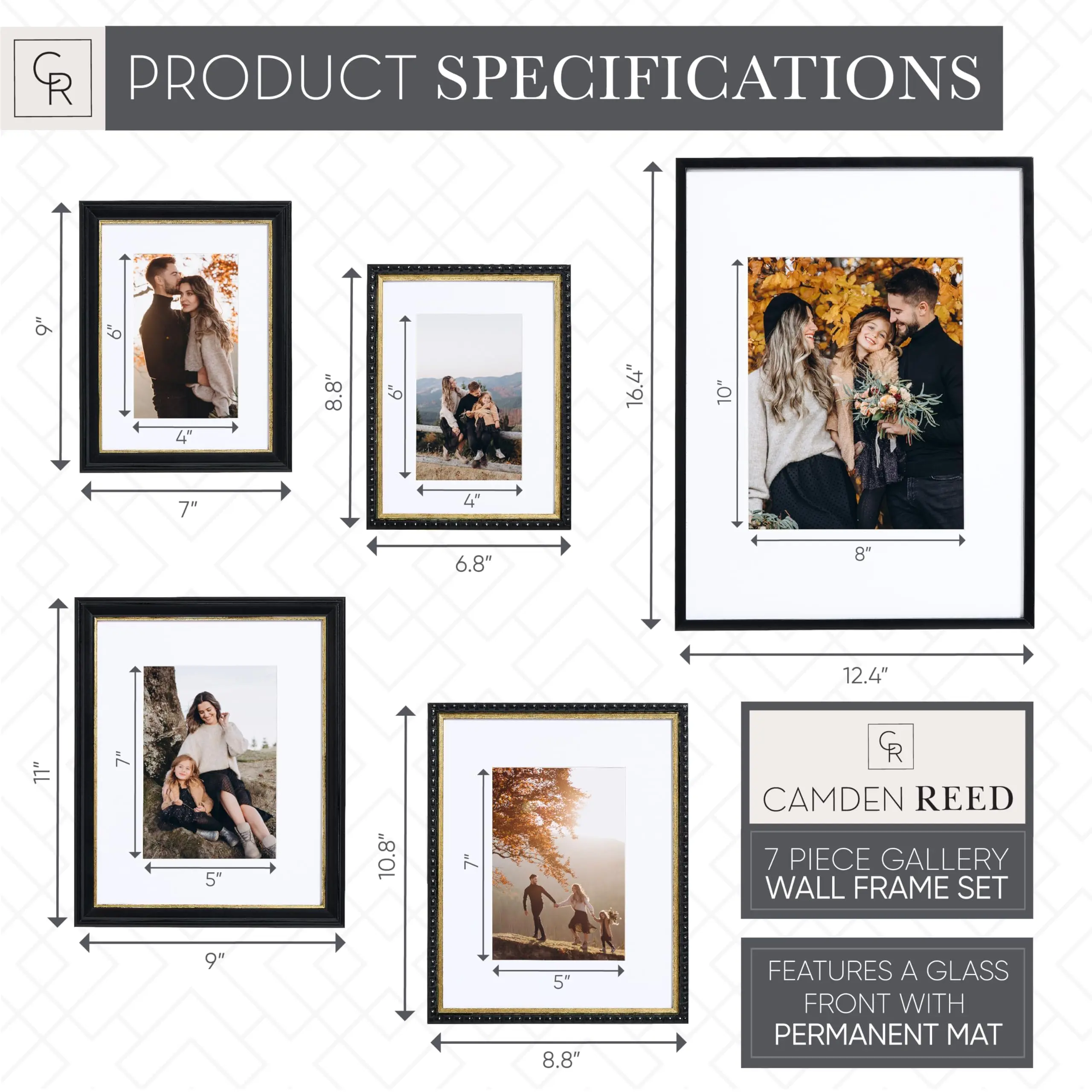 Elevate your home décor with the Camden Reed 7 Piece Gallery Wall Frame Set, meticulously designed to showcase your cherished memories in style. This set includes a versatile combination of frame sizes: one 12x16 inch frame, two 8x10 inch frames, and four 6x8 inch frames, great for creating a personalized gallery wall.