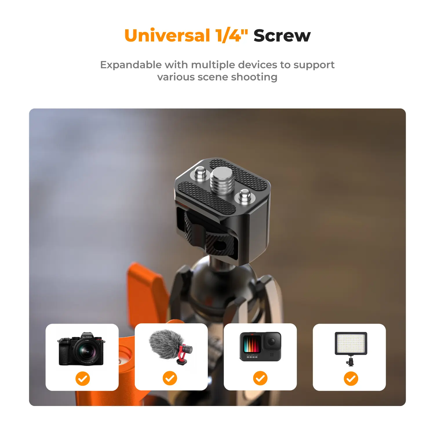 Dual 1/4" interfaces + ARRI positioning holes lock devices tight. No shifting mid-shoot, even with cameras, lights, mics, or monitors. Perfect for professional-looking footage every time.
