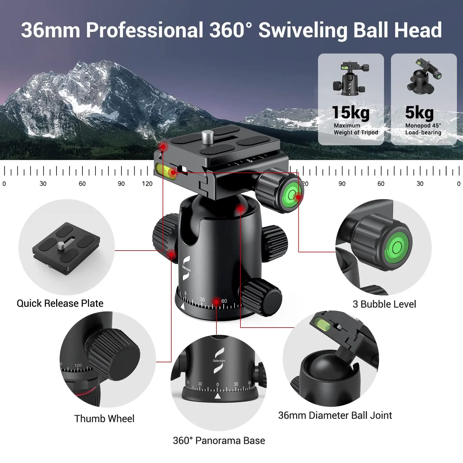·36MM BALL-HEAD: Compared to other ball heads with a diameter of less than 36mm (for example, 28mm,22mm), a 36mm head can provide better stability. The specially designed 36mm metal ball head can rotate 360°, allowing you to take photos at any angle horizontally and vertically. Additionally, the ball head of the tripod is detachable, thanks to the double-headed screw design on the top of the tripod, making the panoramic tripod compatible with 1/4"-20 and threaded holes ball head or fluid head.