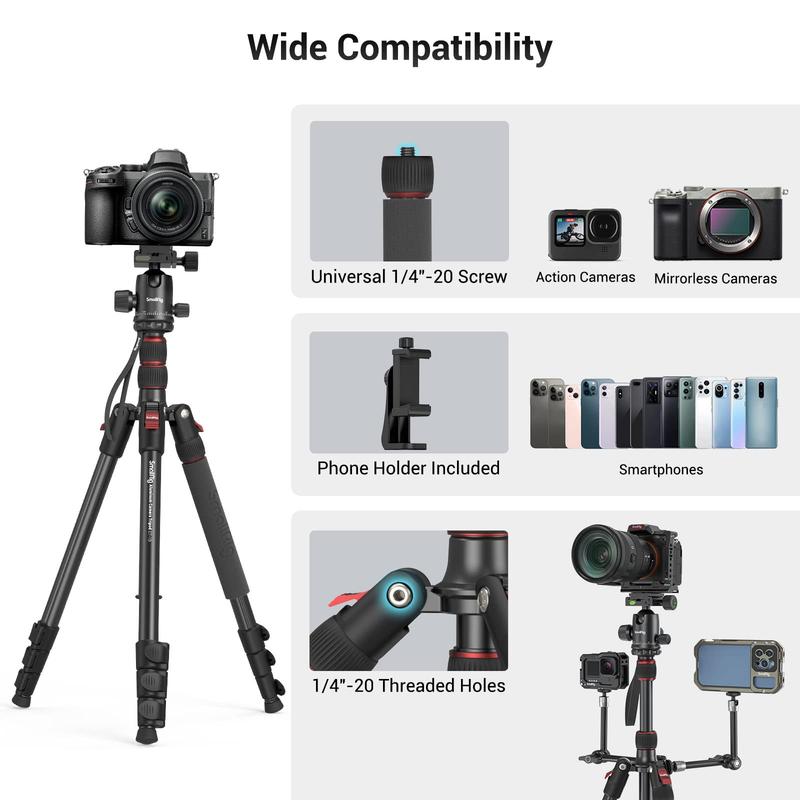·Wide Compatibility: This camera tripod is universally compatible with cameras and devices with 1/4"-20 and 3/8"-16 threaded holes, such as DSLR cameras, action cameras and mirrorless cameras, etc. It can also be used with cell phones and projectors. 【Note】For cameras with telephoto zoom lens, you need to purchase additional tripod mount ring or telephoto lens mount for better balance.