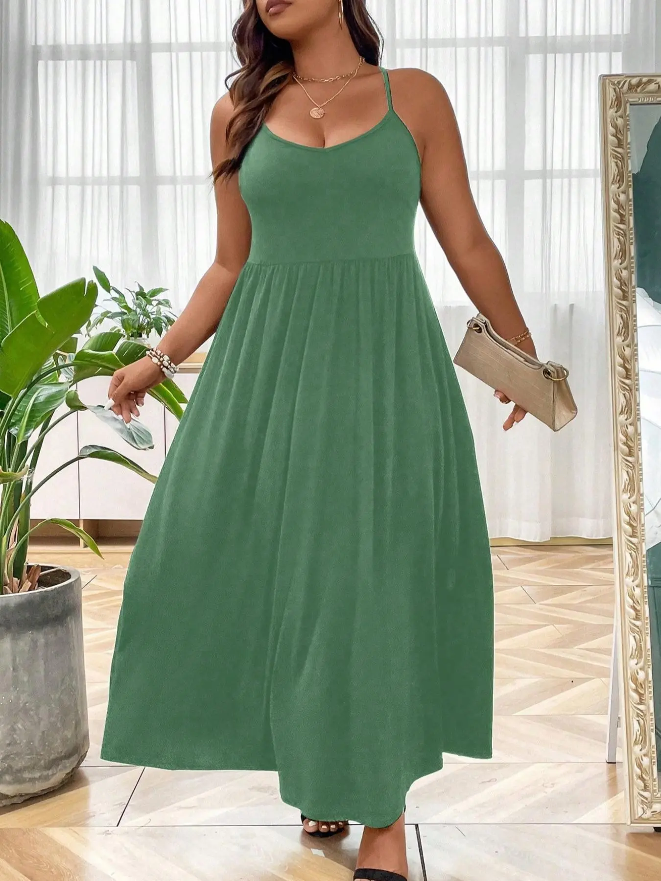 Love this cami dress and it's versatile to be able to wear in the fall with a duster or sweater. The material is soft and I love the flow, doesnt make you look like a balloon. The reason I gave 4 stars it's not the same color in advertisement. It's more of a light sage color.