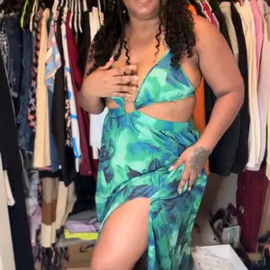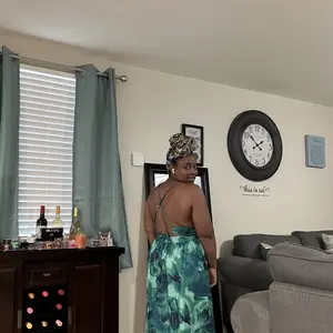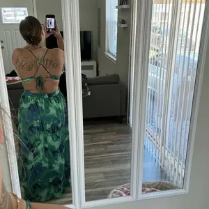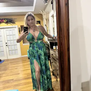 I was kind of shocked at the quality of this dress! It is absolutely gorgeous 💚. I’m wearing an XL, I’m 5’7 and 220lbs. The dress almost touches the floor it has a zipper for the bottom half and it ties up on the upper half. It’s super comfy and did mention it’s absolutely gorgeous 🥰