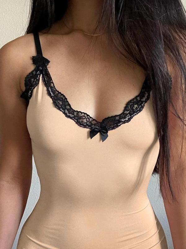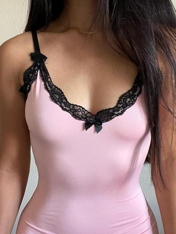 Women's Colorblock Contrast Lace Bow Decor Split Hem Cami Dress, Elegant Sleeveless Bodycon Mini Dress for Party Club Dating Wear, Ladies Summer Clothes