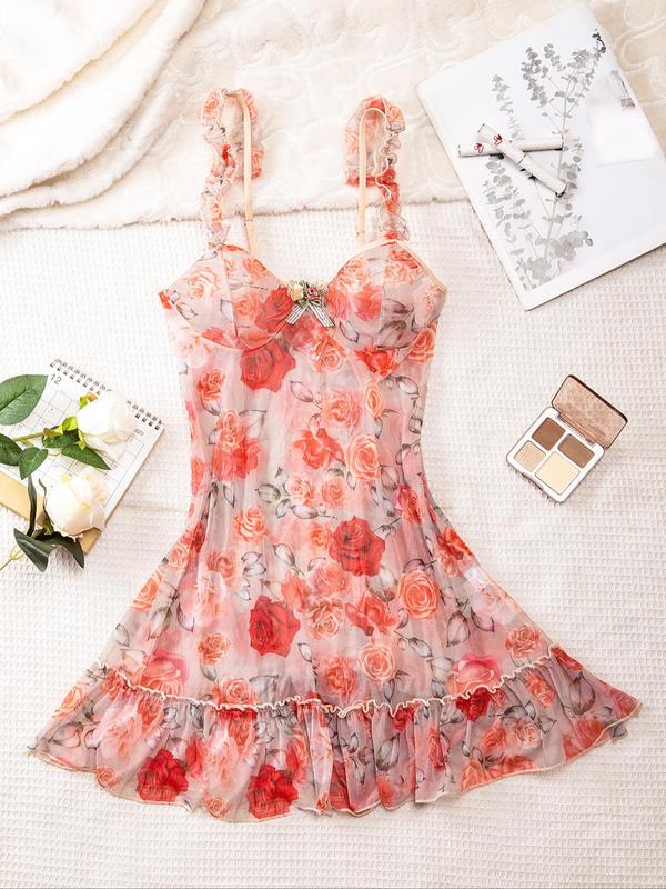 Women's Floral Print Bow Front Frill Tulle Cami Nightdress, Sexy Fit Spaghetti Strap Sleep Dress for Summer, Fashion Comfy Sexy Women Lingeries, Elegance Glam Lounge Wear, Nightwear, Womenswear