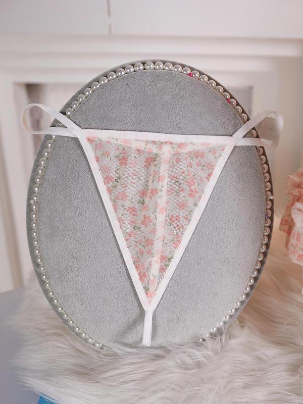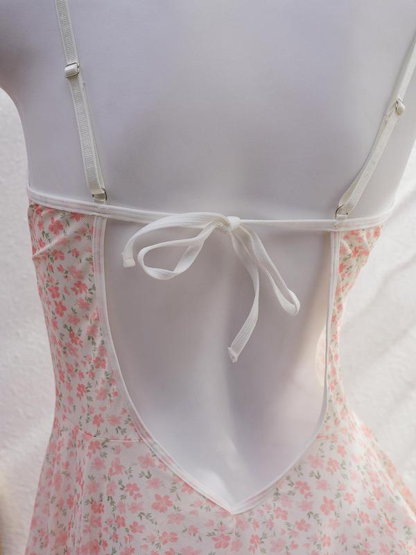 Women's Ditsy Floral Print Bow Decor Frill Trim Mesh V Neck Cami Nightdress & Thong Sexy Sleepwear Two-Piece Set, Romantic Fashion Adjustable Strap Tie Back Backless Ruffle Hem Nightgown & Panty, Women's Sleepwear for All Seasons