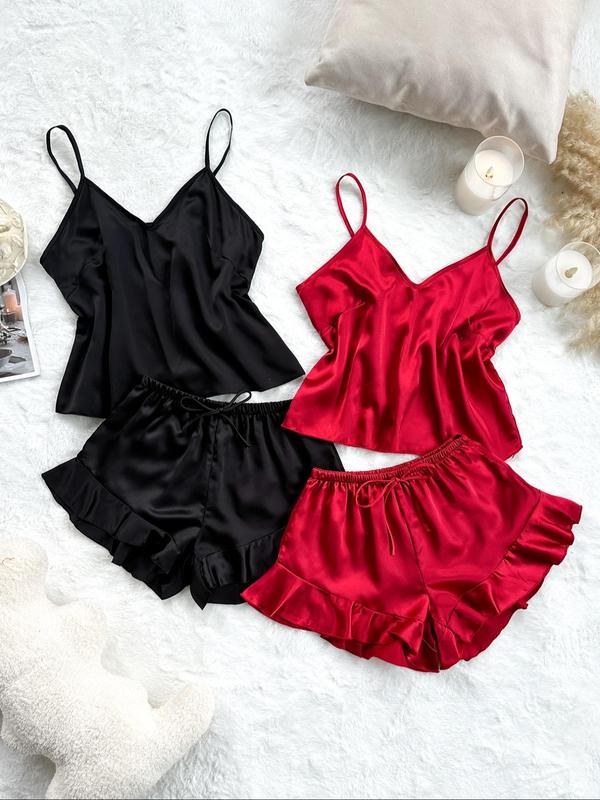 Women's Solid V Neck Cami Top & Elastic Waist Bow Decor Shorts Satin Pyjama Set, Elegant Adjustable Spaghetti Strap Camisole & Ruffle Hem Shorts PJ Set, Ladies Sleepwear for All Seasons, Camisole Sets