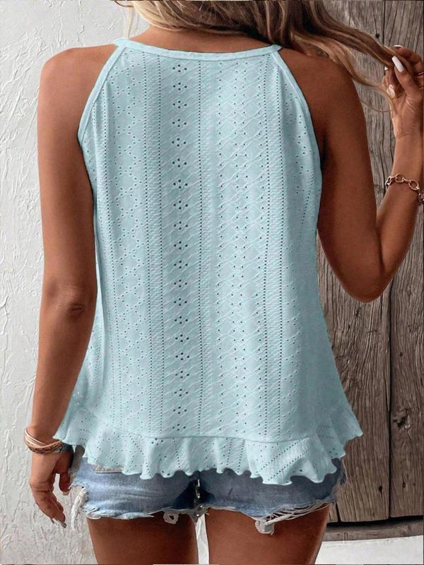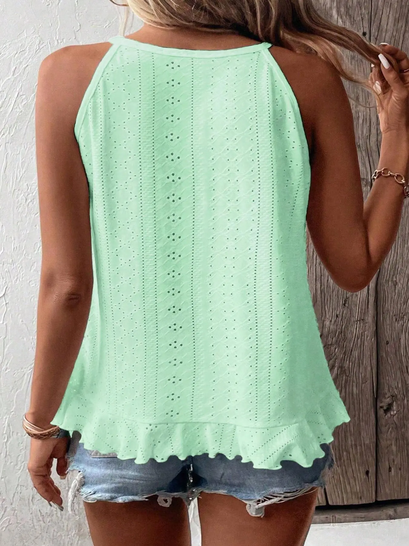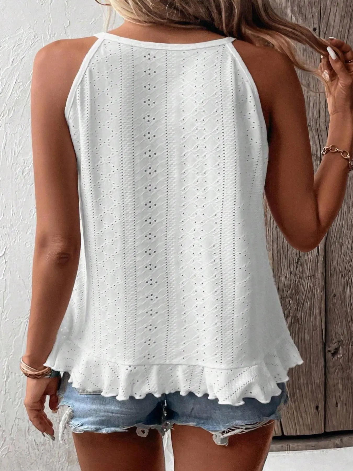 Very cute tank with the eyelets. Well made. Love the semi swing cut. Low enough to cover flaws. Feminine and dainty.