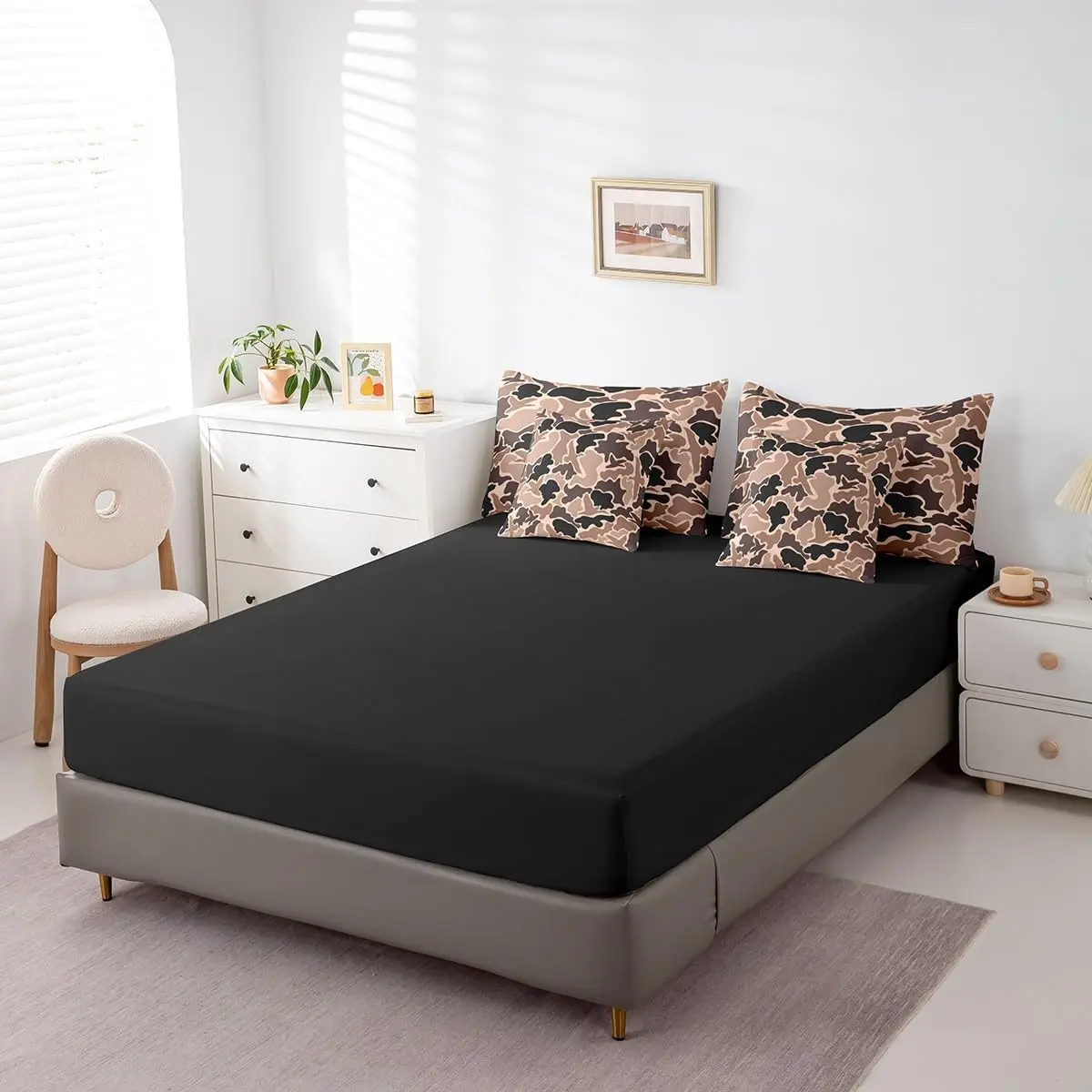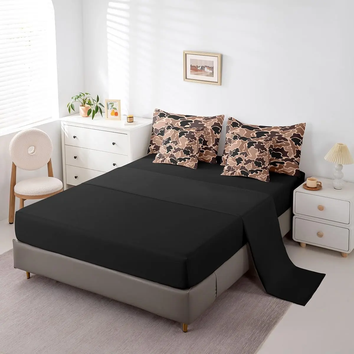 Fast shipping and good quality! Comes with black sheets (fitted and top sheet) along with 2 regular pillow covers and the 2 decorative pillow covers!