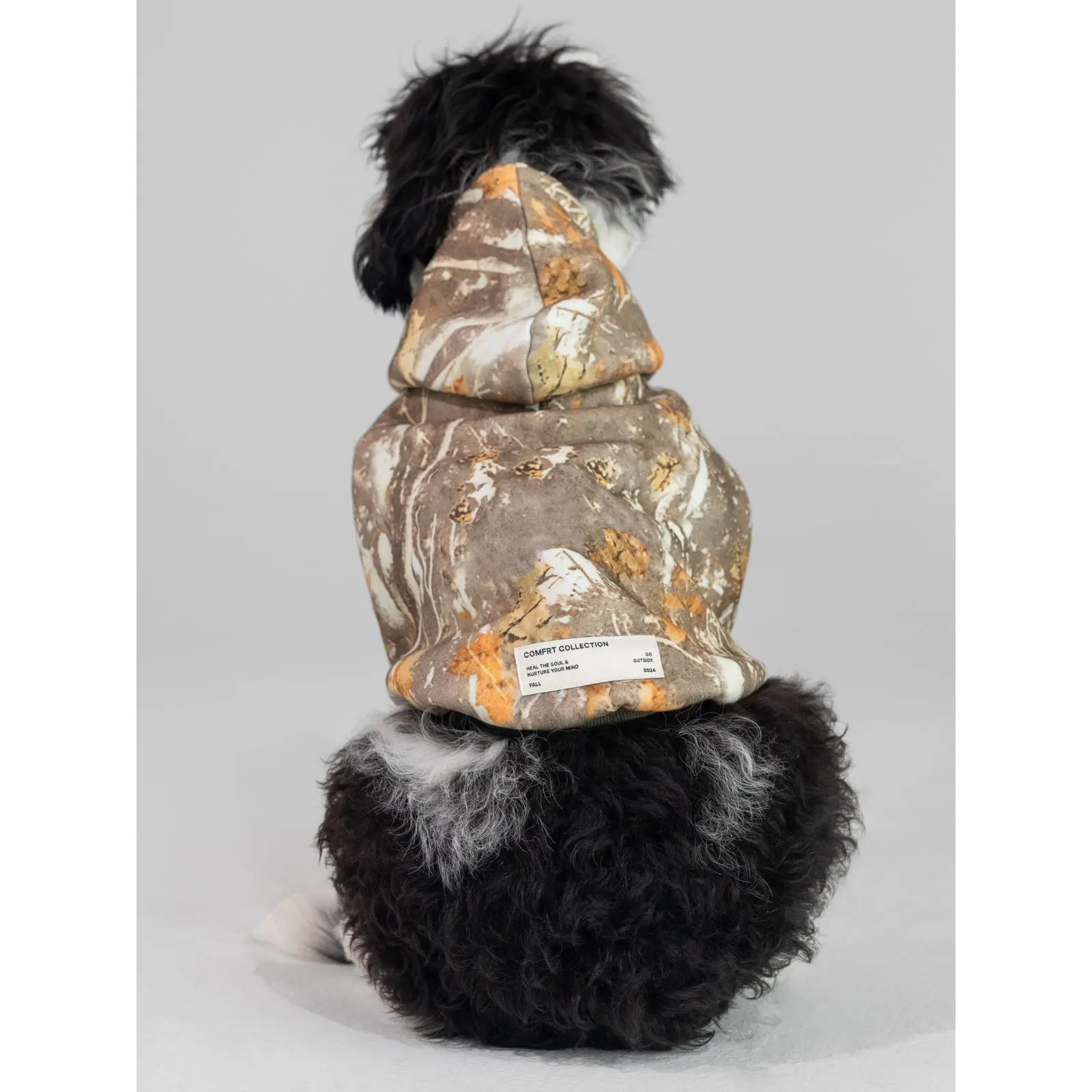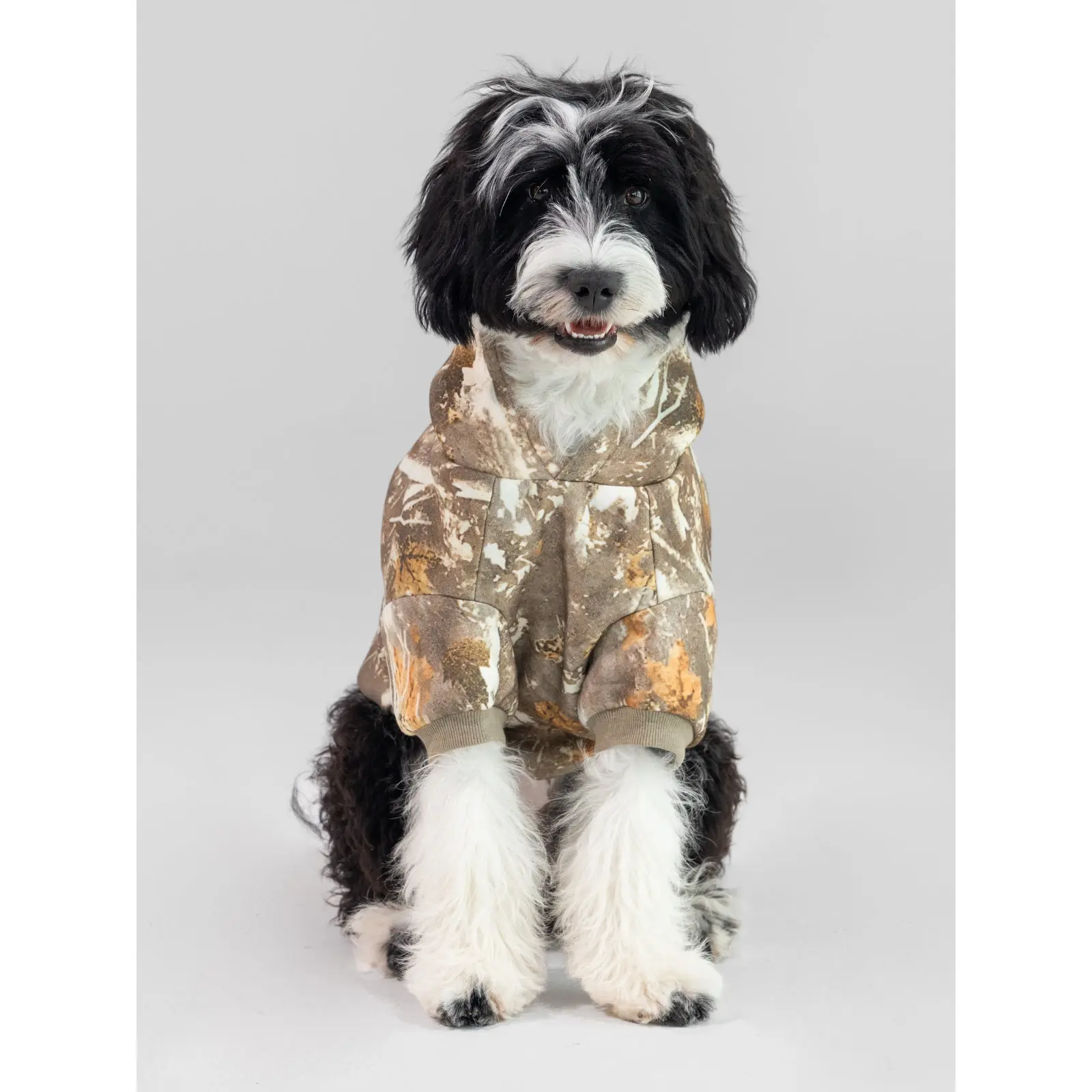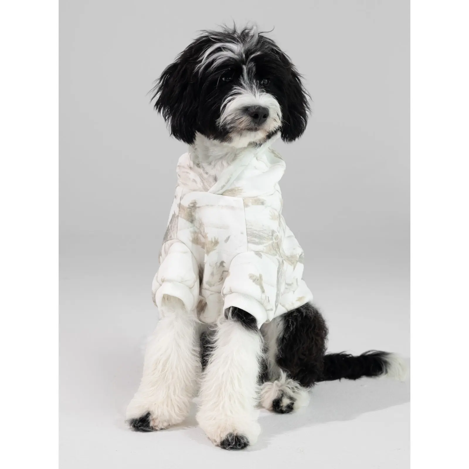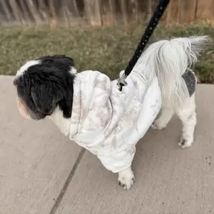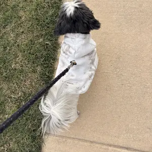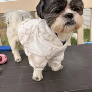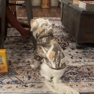 Got me and my baby the matching white oak hoodies. He’s a 12lb Shih Tzu wearing a small (with a harness underneath) Looking at reviews the hoodies seemed to run large for small dogs. Chart says he should be a Med. But I didn’t want it too big to where he might pee on it, small fits him perfect!