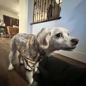 My golden retriever and I are finally matching! We absolutely LOVE this hoodie for him. He is a 65lb male and the size 5x fits him perfectly with the exception of the hoodie which is too tight to put on him. The 6x hoodie part may fit him better but the body of the hoodie would be way too big...