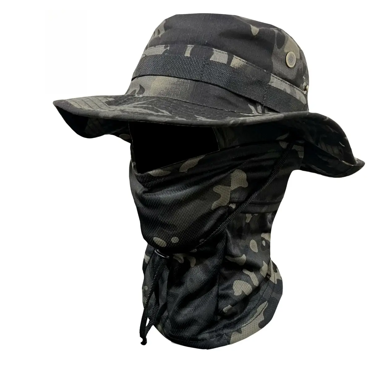 A practical and versatile bucket hat designed for outdoor adventure and casual wear, featuring a classic camo pattern and secure, windproof details.