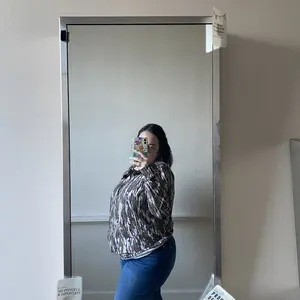OBSESSSSED! I wish I had downsized! I had to pull it towards the back for this Pic! Very soft, stretchy, and light-weight! Will definitely be buying again in a smaller size as well as other prints!