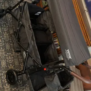 This wagon is amazing. Perfect for two kids to sit, plenty of room for their legs and all your bags and other items. It’s easy to push, folds up really well and fits in your trunk. I was looking at getting a much more expensive wagon, and I’m SO glad I got this one. It’s really great and works well.