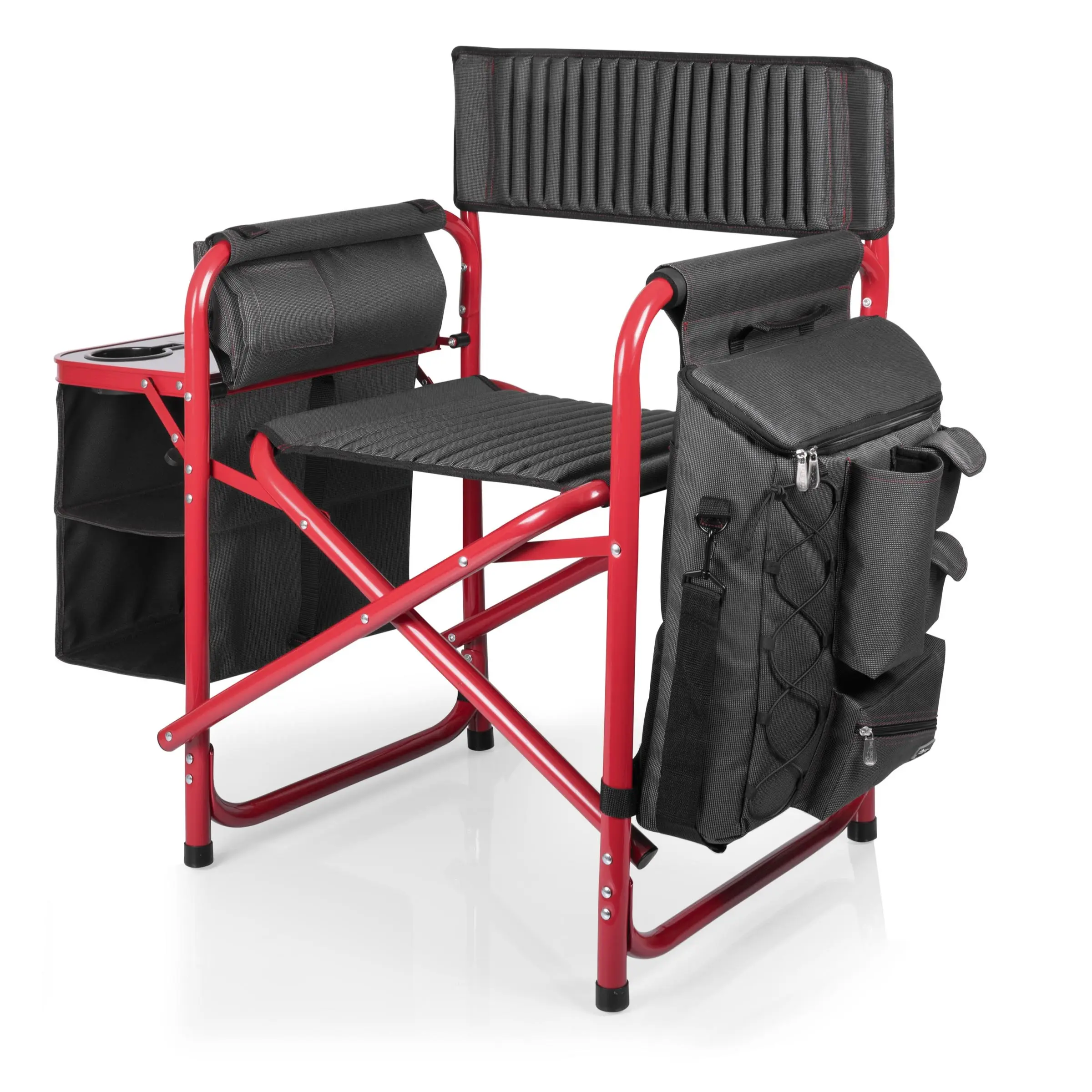 Fully-detachable, side-mounted 24+1-can insulated cooler with a multitude of storage pockets and adjustable shoulder strap so cooler can be used independent of the chair