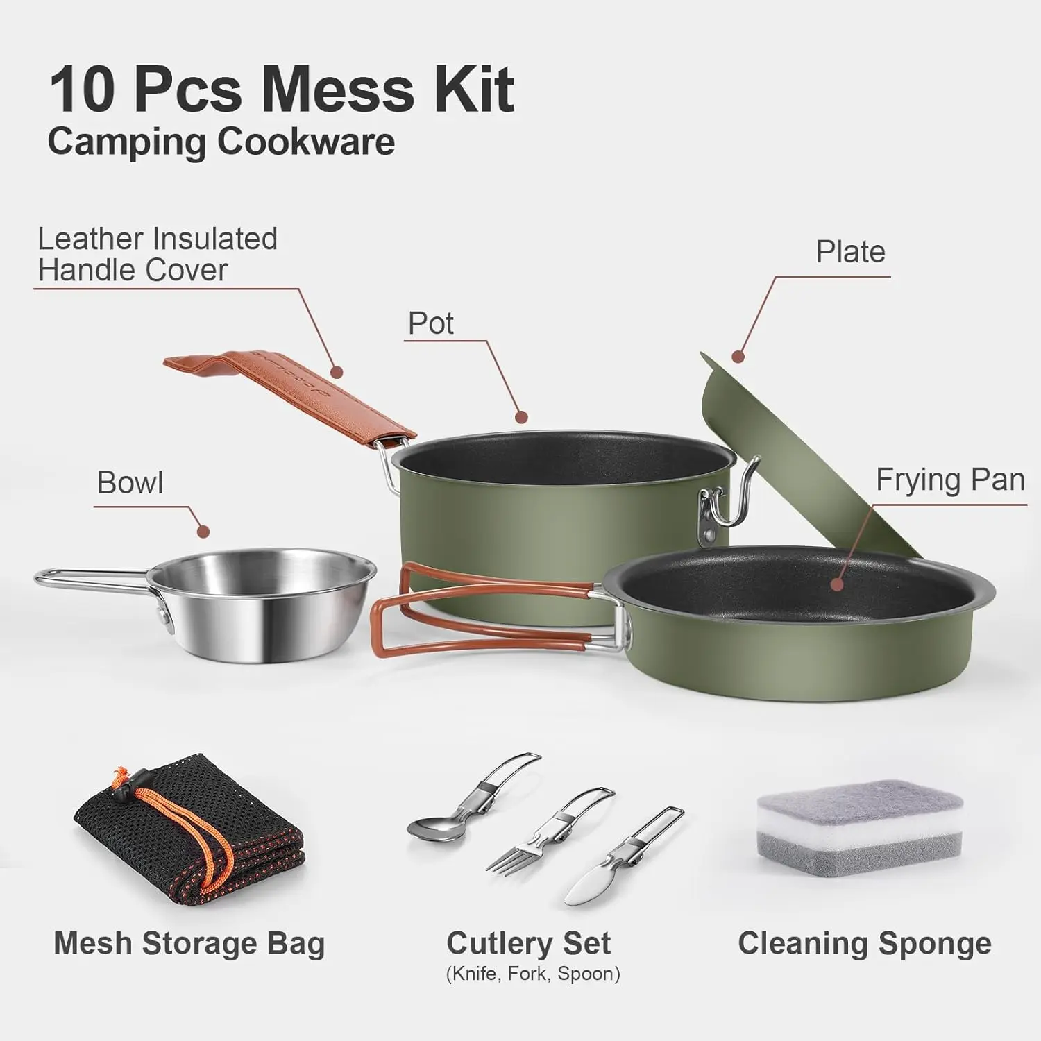 ·Complete Camping Cookware Set - The 10pcs set includes 1 x 1.3L pot, 1 x frying pan, 1 x plate, 1 x stainless steel bowl, 1 x leather-insulated handle cover, 1 x mesh storage bag, stainless steel cutlery set (1 x knife, 1 x fork, 1 x spoon) and 1 x cleaning sponge to meet all your outdoor cooking needs.