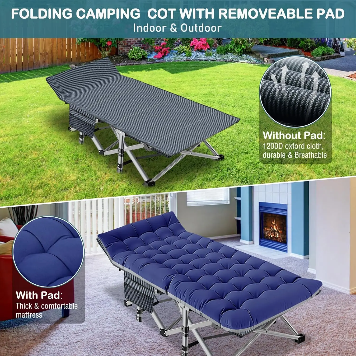 2 Sided Comfortable Mattress: Equipped with 2 Sided Mattress, Reversible Cushion, you can sleep more comfortably in this portable folding camping bed. In hot weather, the cushion can also be taken away for the breathable. 3.3 inch thickened pearl cotton pad (keep warm in autumn and winter).