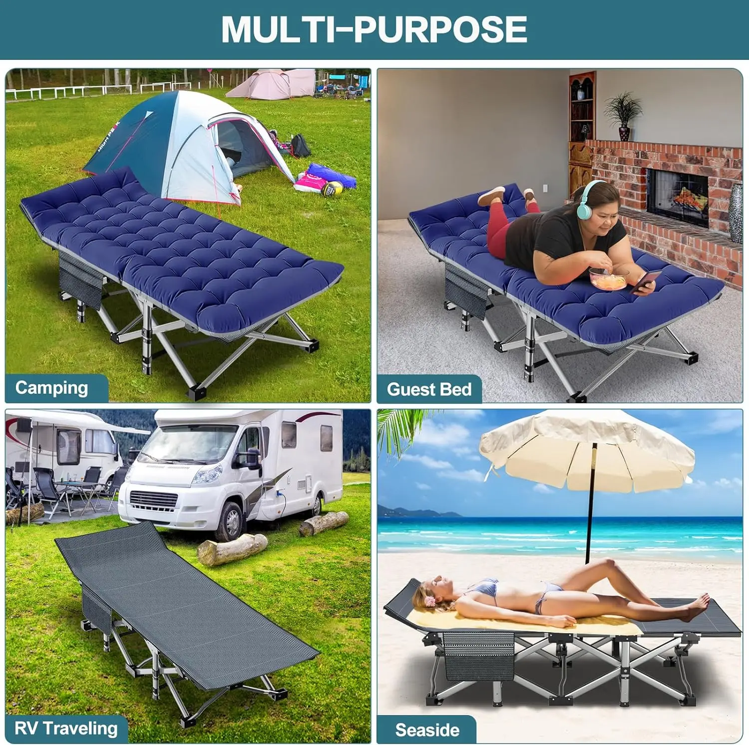 Wide Range of Uses: This cot bed not only as camping, patio and pool furniture, but also in beauty salons and reflexology offices. The portable cot is perfect to be used at the park, beach, backyard, garden, campsite or other outdoor places. It can be used as a bed for your guest as well. Super convenient!