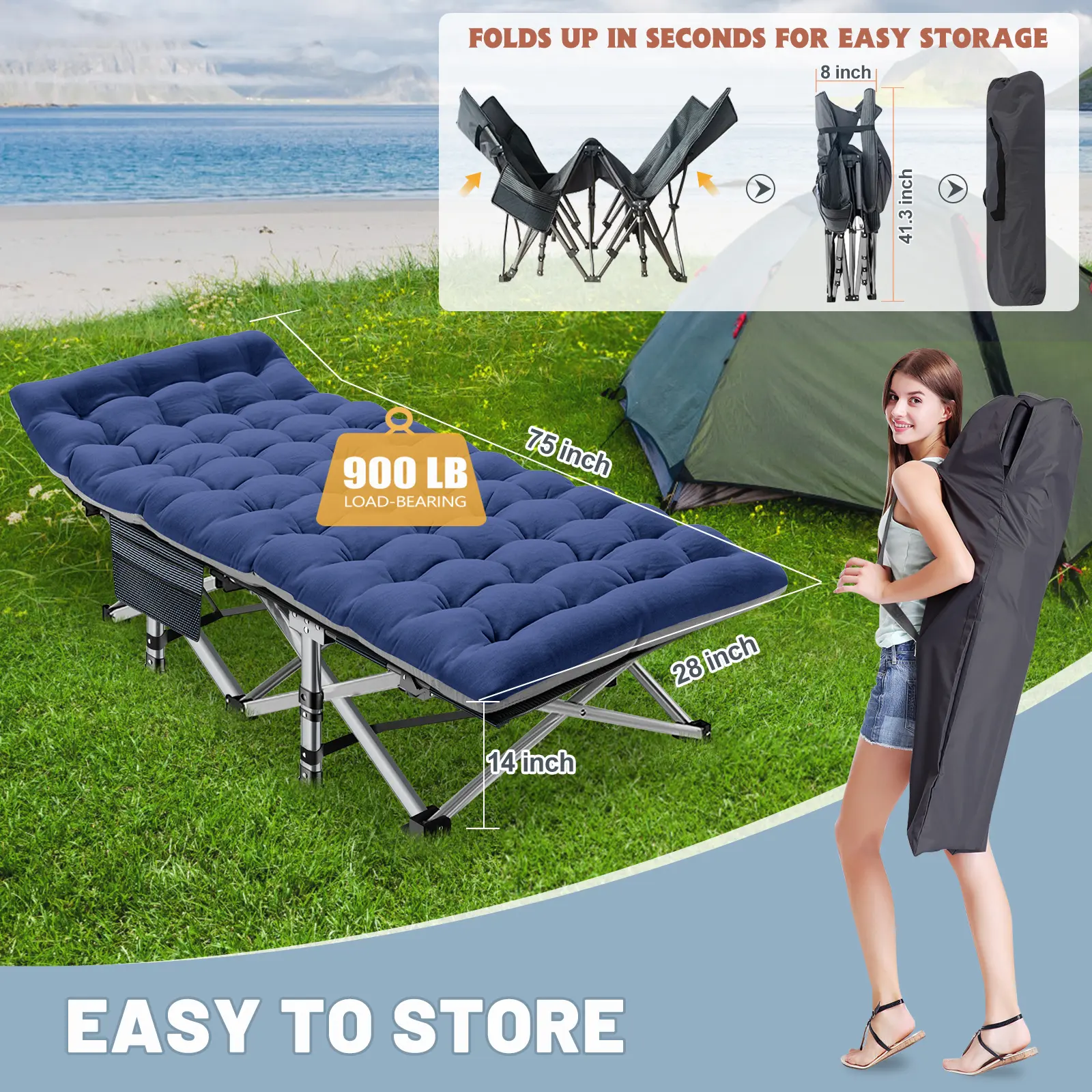【Folding Camping Cot】 The cots for adults measures 75"* 28"* 14" when open, folded dimension is 39'' * 8''. Takes up very little space. With a carrying bag so you can bring it anywhere you want. Fold up to fit inside most car trunks.