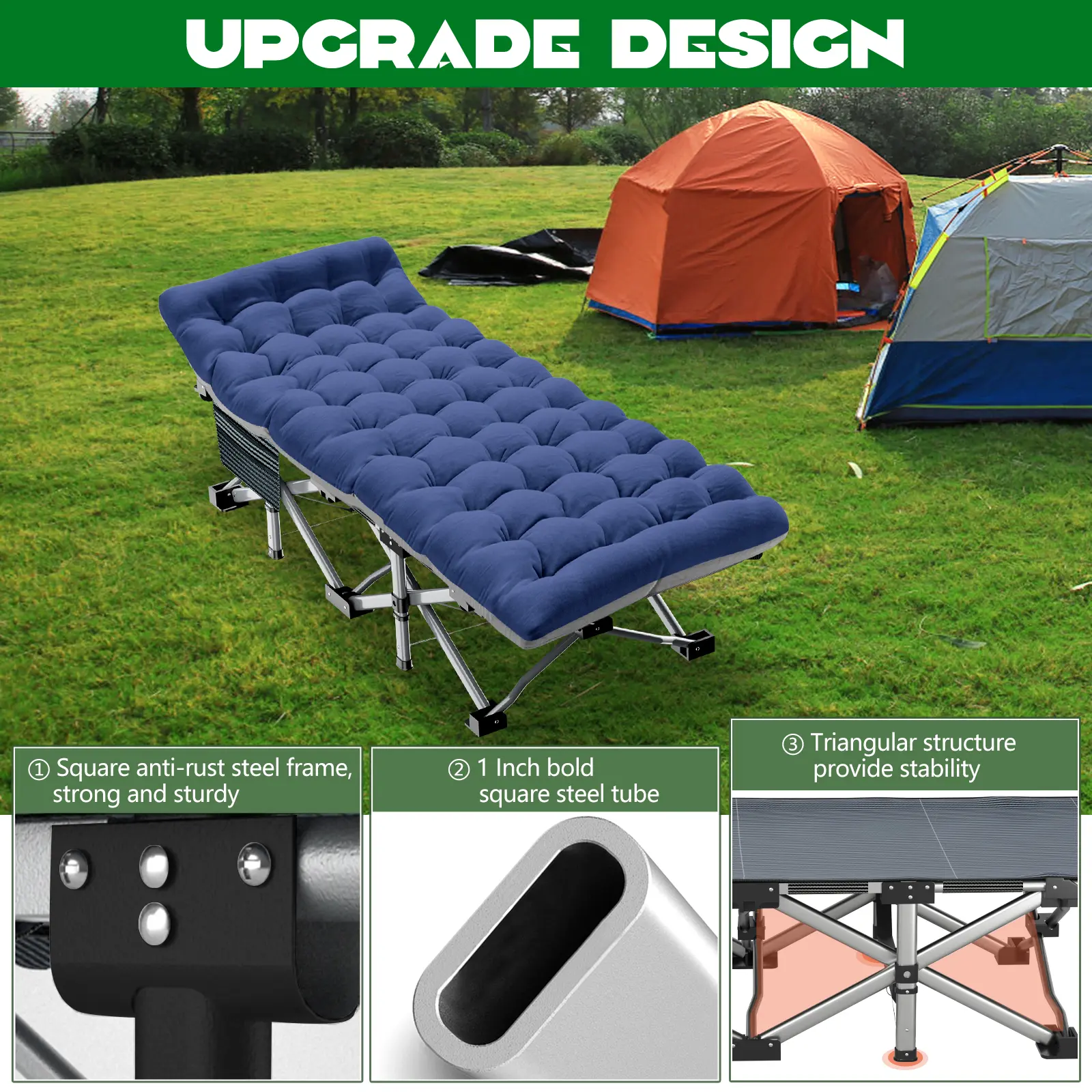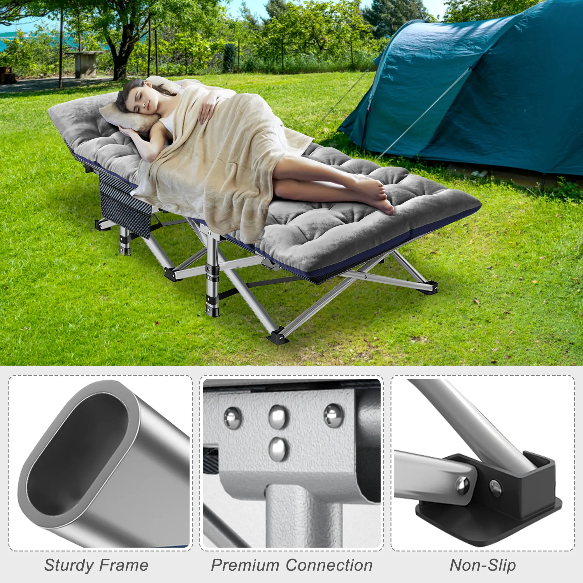 【Cot with Mattress】The camping cots for sleeping have various mattress options. The mattress is soft and removable which is more comfortable and warm during sleep. You can take it away when you don't need it. The pad is double-sided and has different colors on both sides, you can choose according to your needs and preferences.