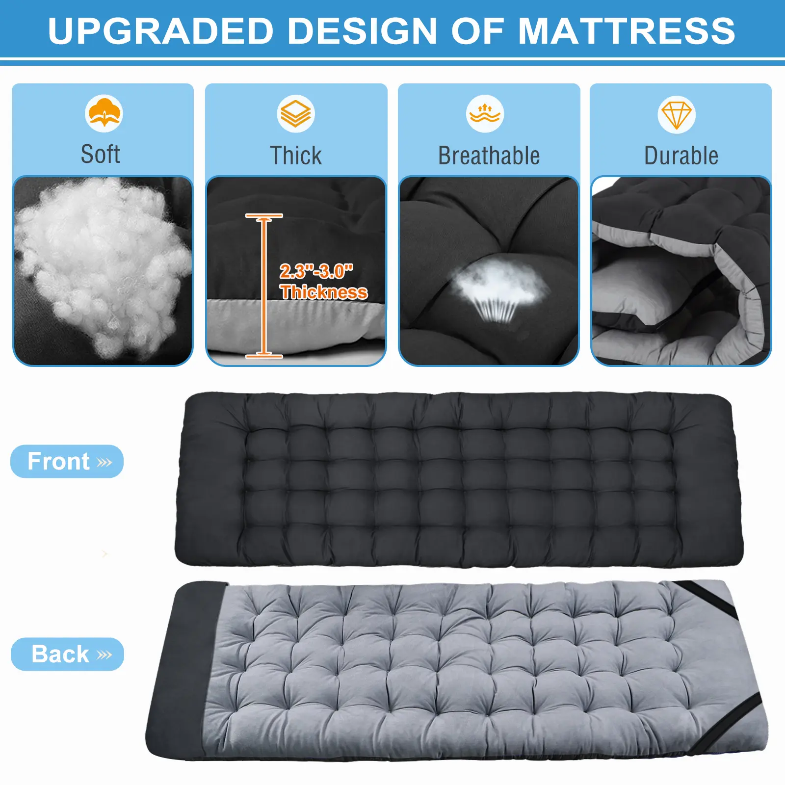 2 Sided Comfortable Mattress: Equipped with 2 Sided Mattress, Reversible Cushion, you can sleep more comfortably in this portable folding camping bed. In hot weather, the cushion can also be taken away for the breathable. 3.3 inch thickened pearl cotton pad (keep warm in autumn and winter).