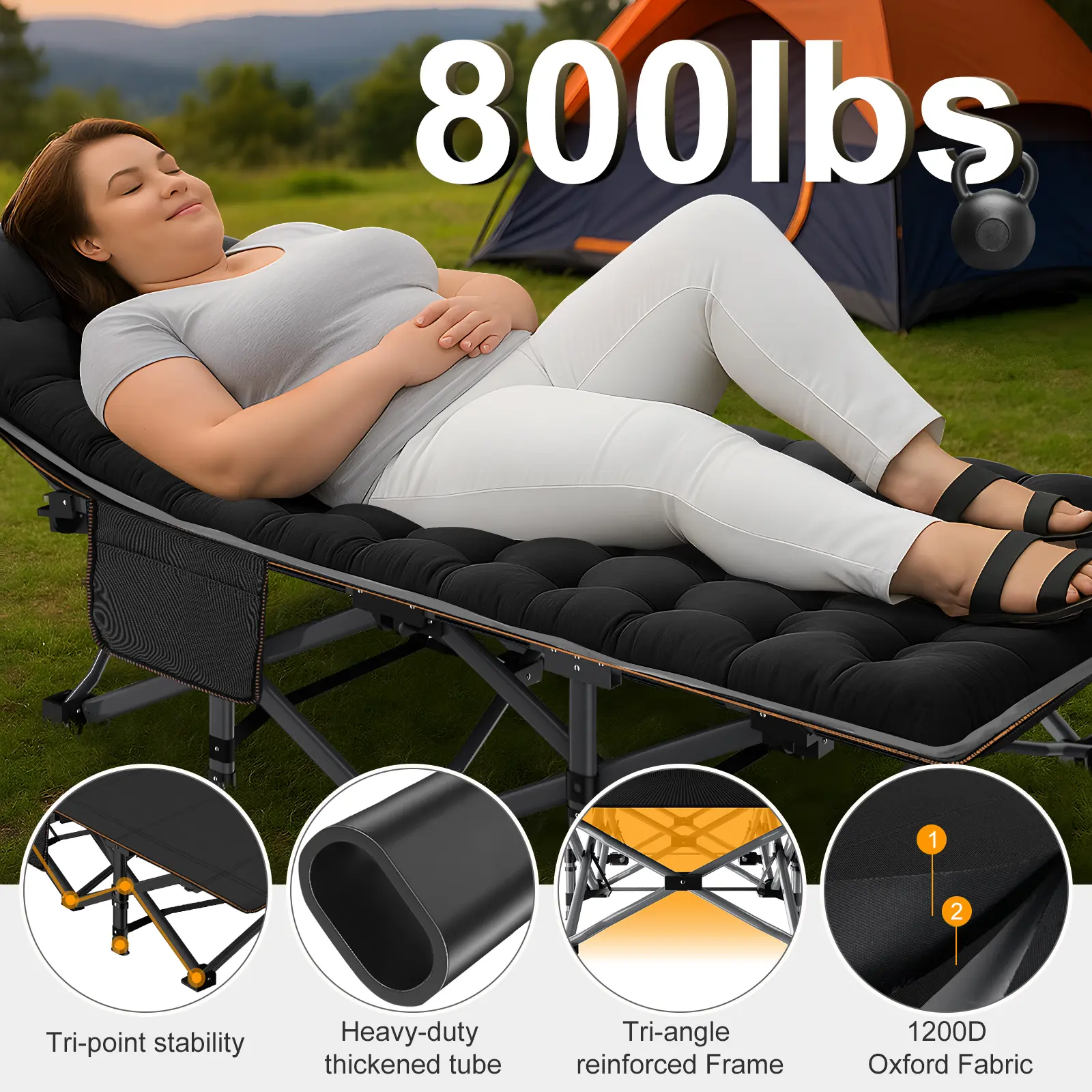 Heavy Duty Cot: Our camp bed is constructed in a Double Layer of 1200 D oxford for Superior Strength, Water Resistance & Easy- Cleaning. For cleaning, you can wipe the top fabric and the poles with a wet cloth. The folding cot features a unique square high-strength steel tube design. Supports up to 800 lbs. Can carry 1 adult or 2 children to sleep on it.