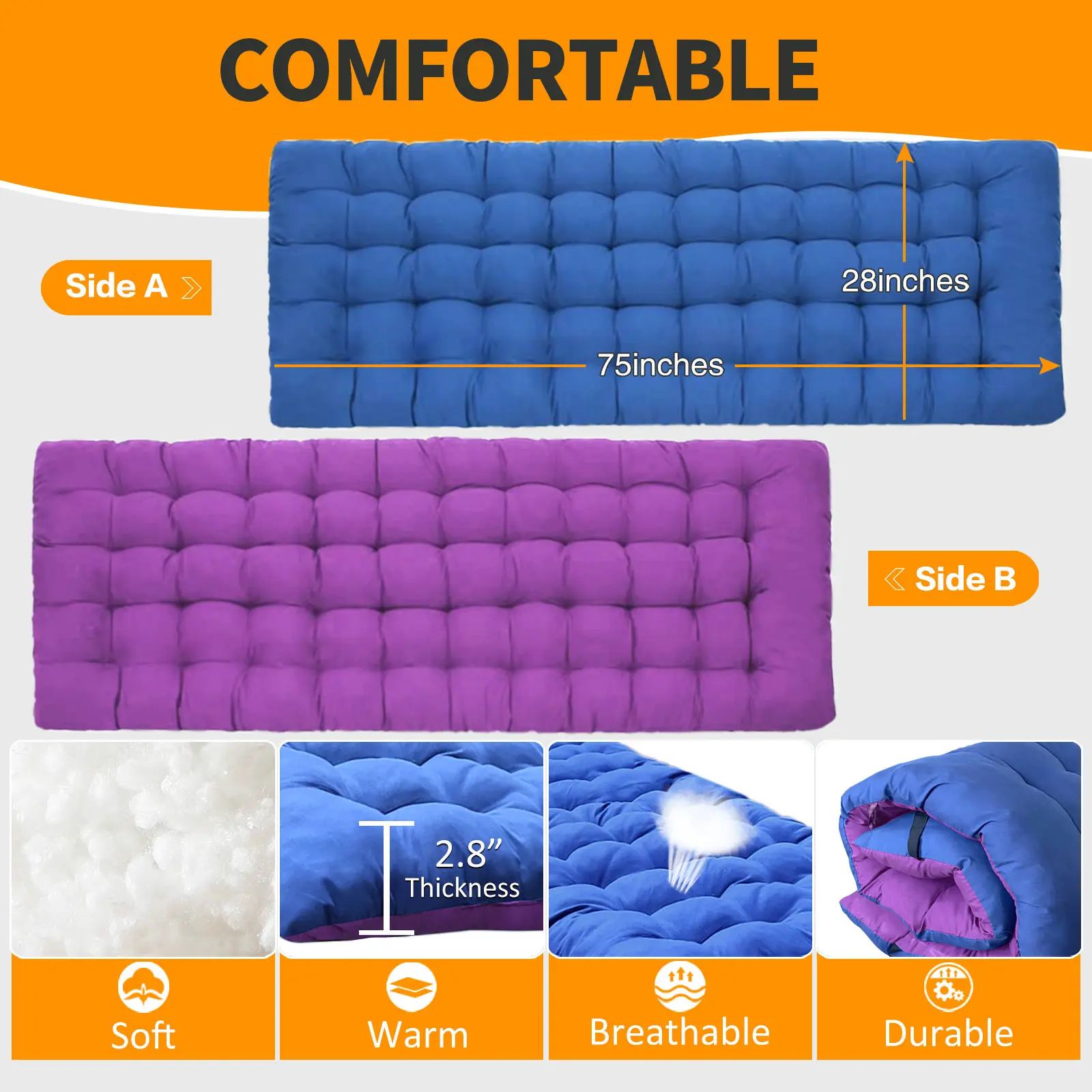 The description on this item is not for the one pictured. The bed with the blue /purple pad is the smaller version (XL 75"x 27") Not the one I thought I was getting. That being said, if you don't mind this size it is very nice and would work for a child or small adult. The XXL version is better.
