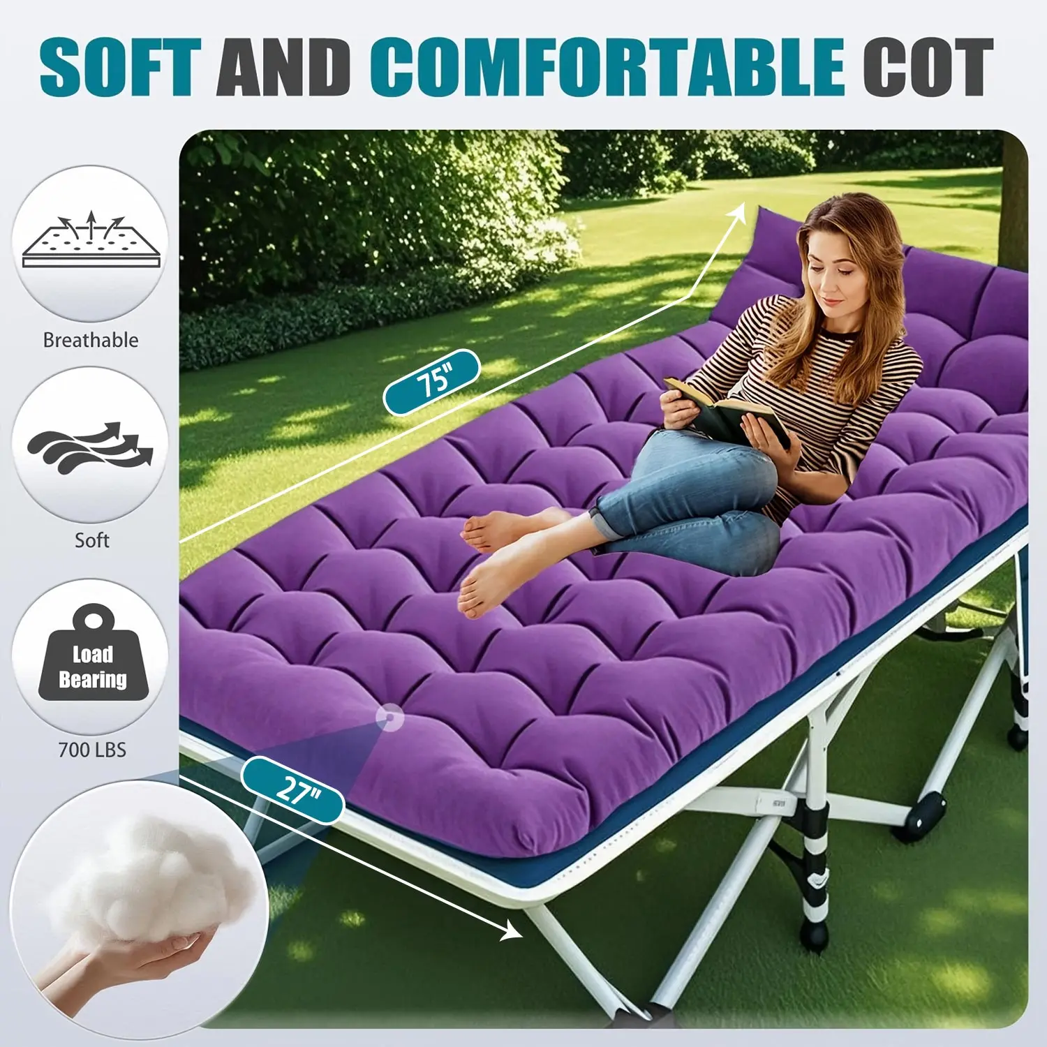 Cot works fine but the cushion is definitely not as thick as the ad makes it seem