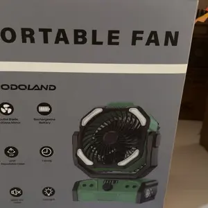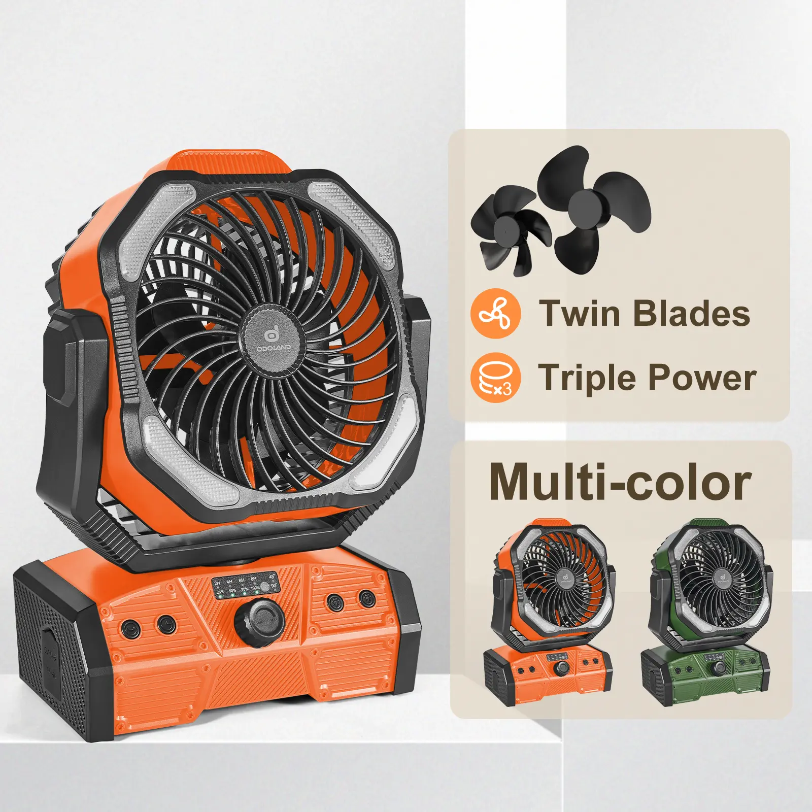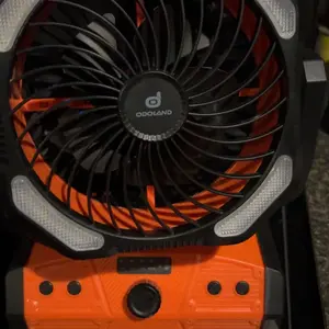 The Odoland fan features a double blade design for enhanced airflow. It includes 3 brightness levels and 2 lighting colors, providing soft light at night and strong lights for outdoor activities. The sleep mode turns all lights off after a 2-second long press and restarts in normal mode.