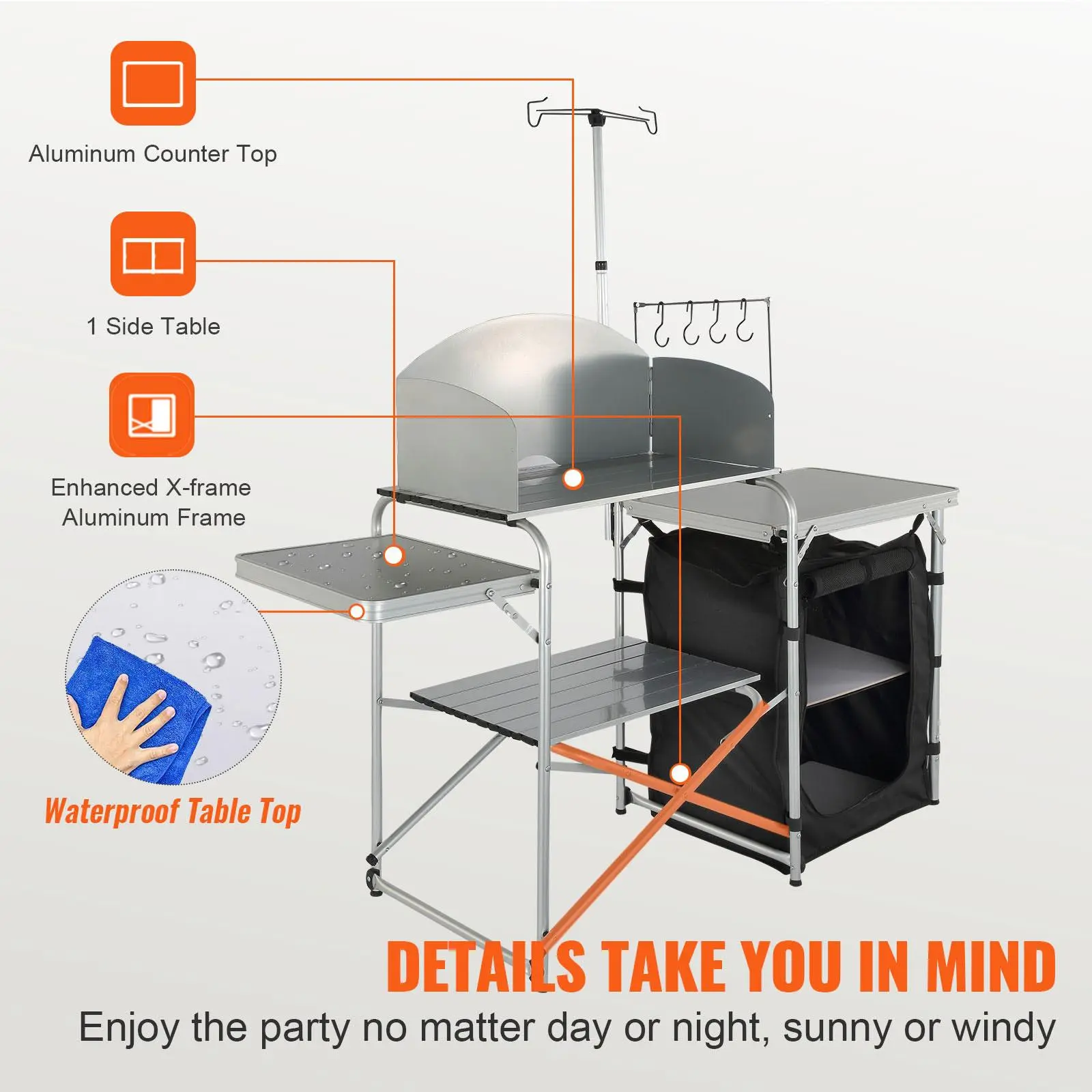 • Great Space Management: Our camping kitchen table is designed to take your kitchen outside! You can organize your food, stoves, grills, and cookware in an orderly manner on the tabletop, zippered storage compartments, side table, and storage shelf. You can hang the spatula, ladle, tongs, etc on the hooks.