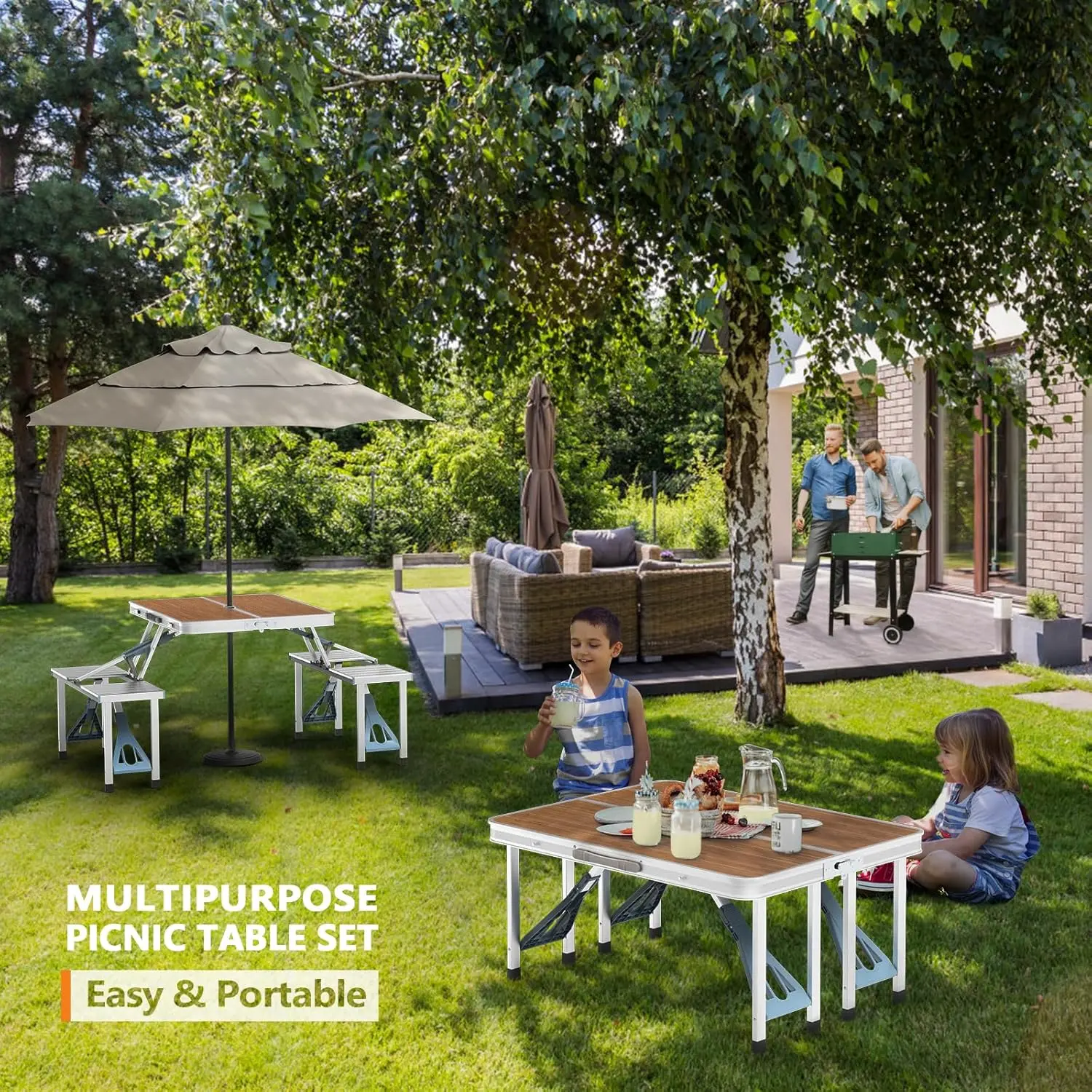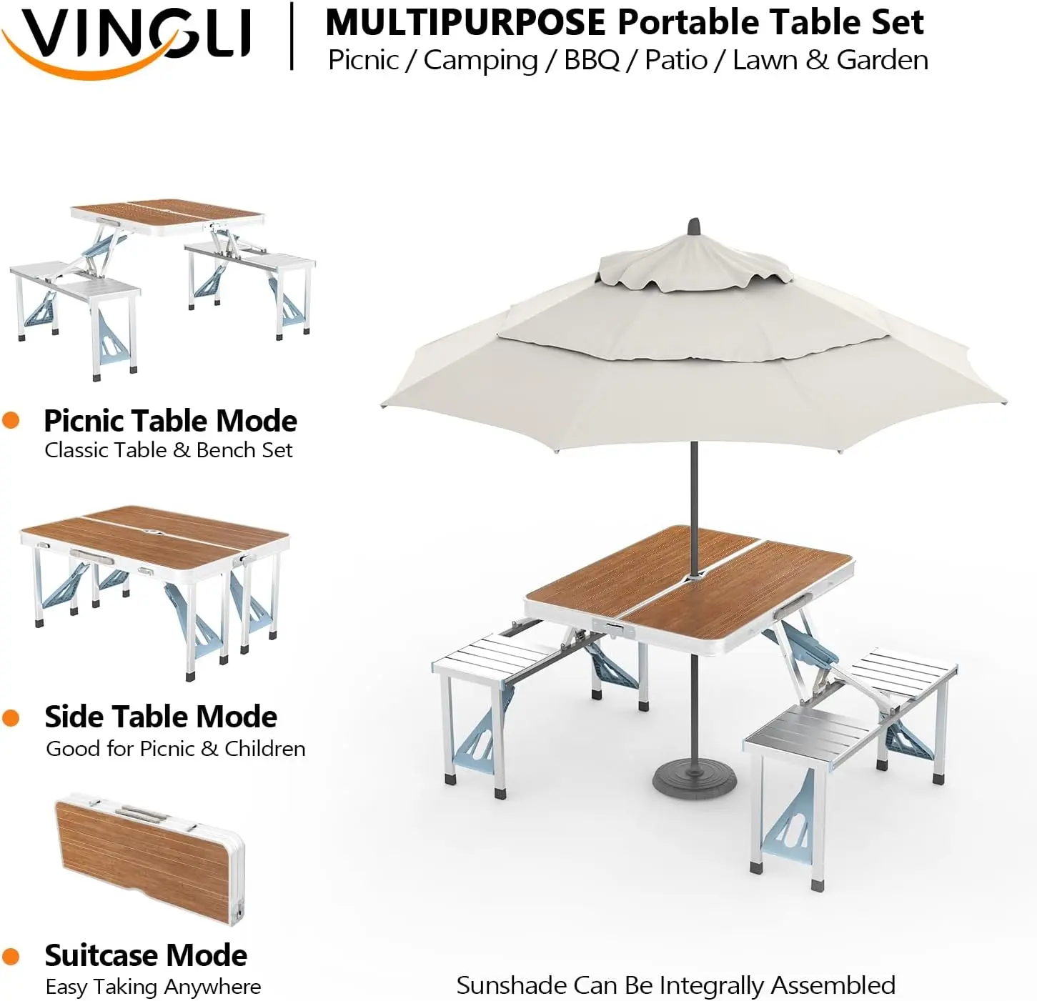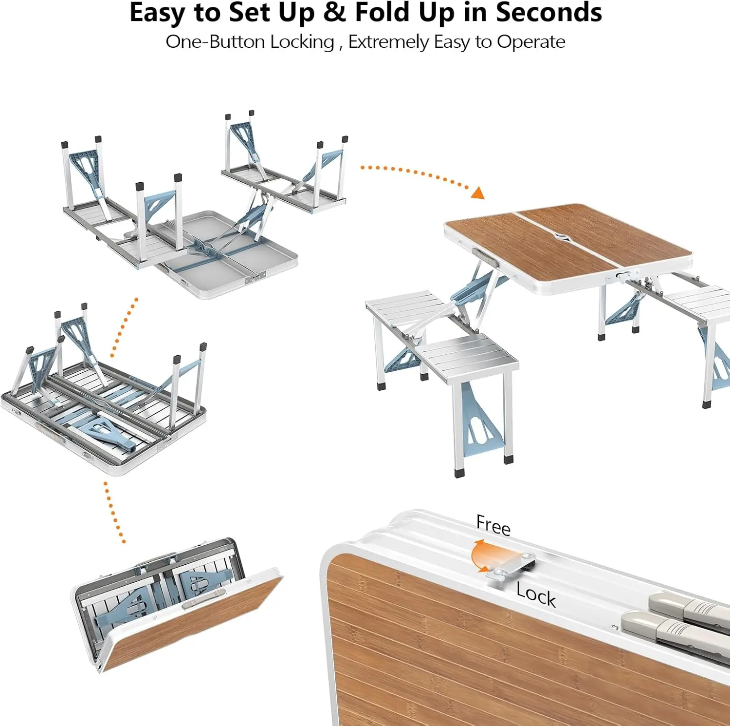 ·Sturday & Durable: Constructed of medium density fiberboard and aluminum alloy frame, Powder-coated allummium legs, four locks at the bottom and non-slip rubber feet help hold the table during every activity. And there is a 1 inch diameter umbrella hole in the middle to put parasol. This picnic set is easy to clean remove stains only by swiping