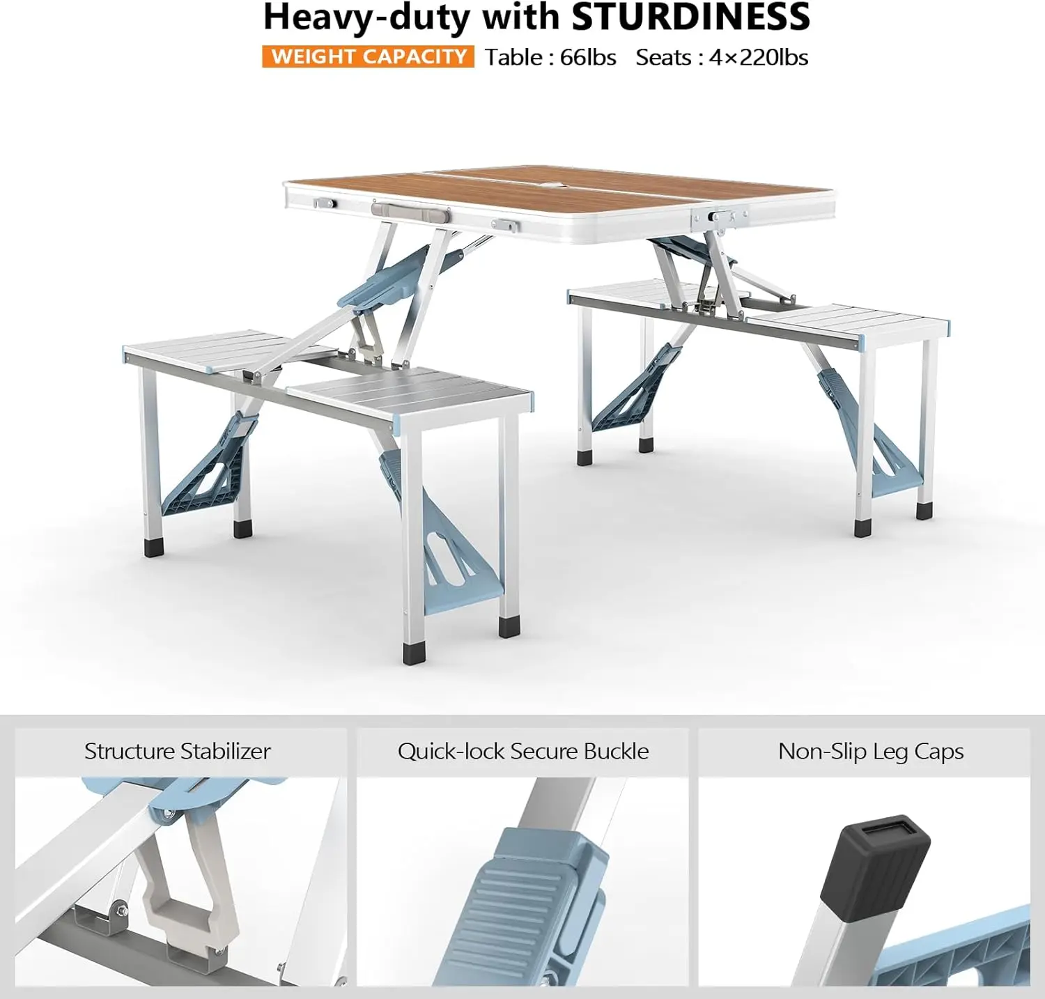 ·220 Load-bearing Capacity: The table could bear max weight of 66lbs, each seat could bear max weight of 220lbs. So the 4 seats can bear 265*4 lbs.