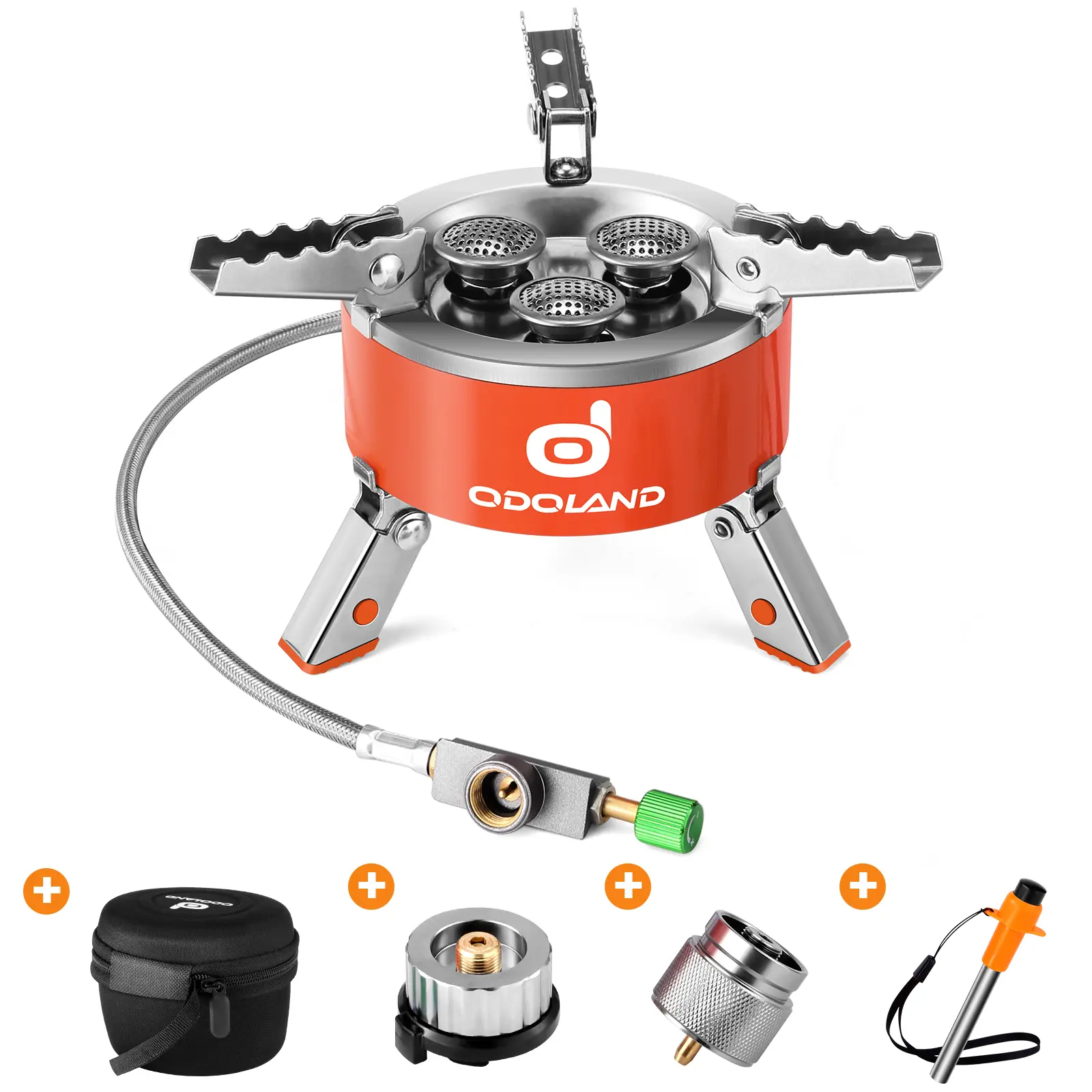 All-in-1 Design - Materials: Constructed from aluminum alloy and stainless steel, offering durability and ease of use. - External Ignition & Flame Controller: For added convenience and practicality. - Adapters: Includes 2 adapters for 3 different gas cylinders, compatible with 7/16 thread single propane/butane-propane mixed fuel canisters (EN 417). - Gas Pipe: 70cm length for safer operation, compatible with gas tanks and firewood.
