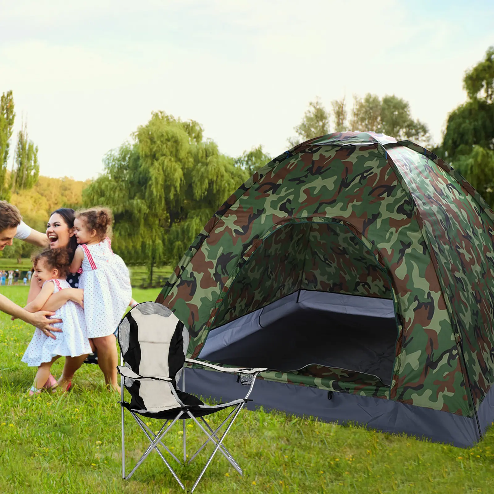 Enjoy entertainment outdoors with the 3-4 Person Camping Dome Tent! It has a spacious room that can sleep up to 4 persons. The dome is made of 180T silver coated polyester, which is breathable, tear-resistant, and UV-proof. Meanwhile, the floor uses strong and waterproof nylon oxford. Glass fiber poles feature high-strength while remaining lightweight. And it can be packed into the included portable bag for ease of transportation. For weekend camping or outdoor adventures, this tent is definitely a great choice. Don't hesitate to order now!