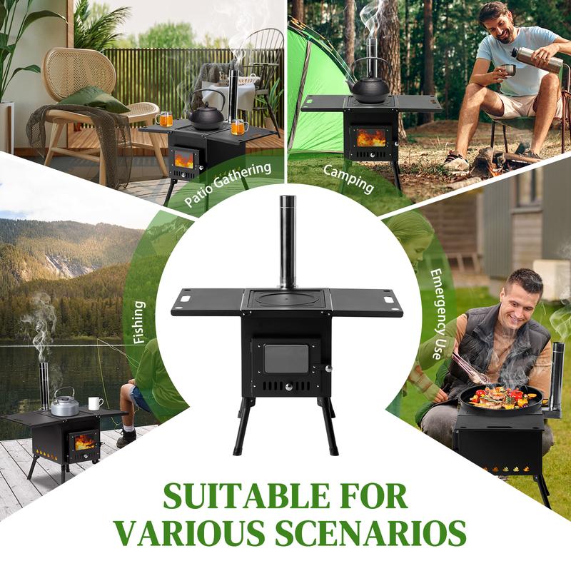 Highly flame retardant upgrade:Camping wood stove including 3 chimney pipes with a diameter and 1 fire blanket. Help you adjust the height to suit various places. Carbon steel with high-temperature heat-resistant black finish.Only for outdoor use with proper ventilation.It is suitable for heating and cooking with friends and family in winter.