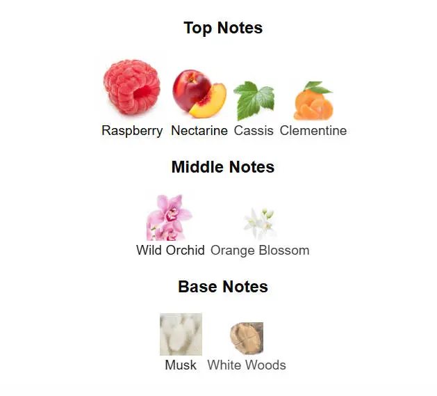 The fragrance opens with a burst of juicy clementine and nectarine, complemented by the sweet notes of cassis and raspberries. The heart notes feature wild orchid and orange blossom that add an exotic touch to this scent. The base notes are composed of wild musk and blonde woods that give it an earthy yet sensual finish.