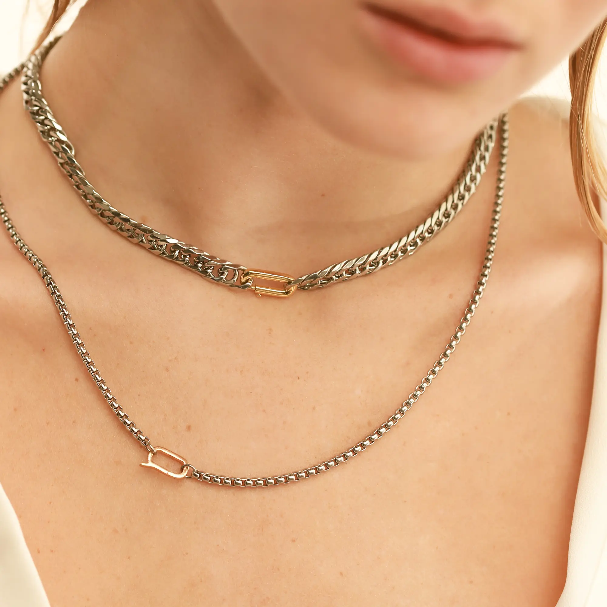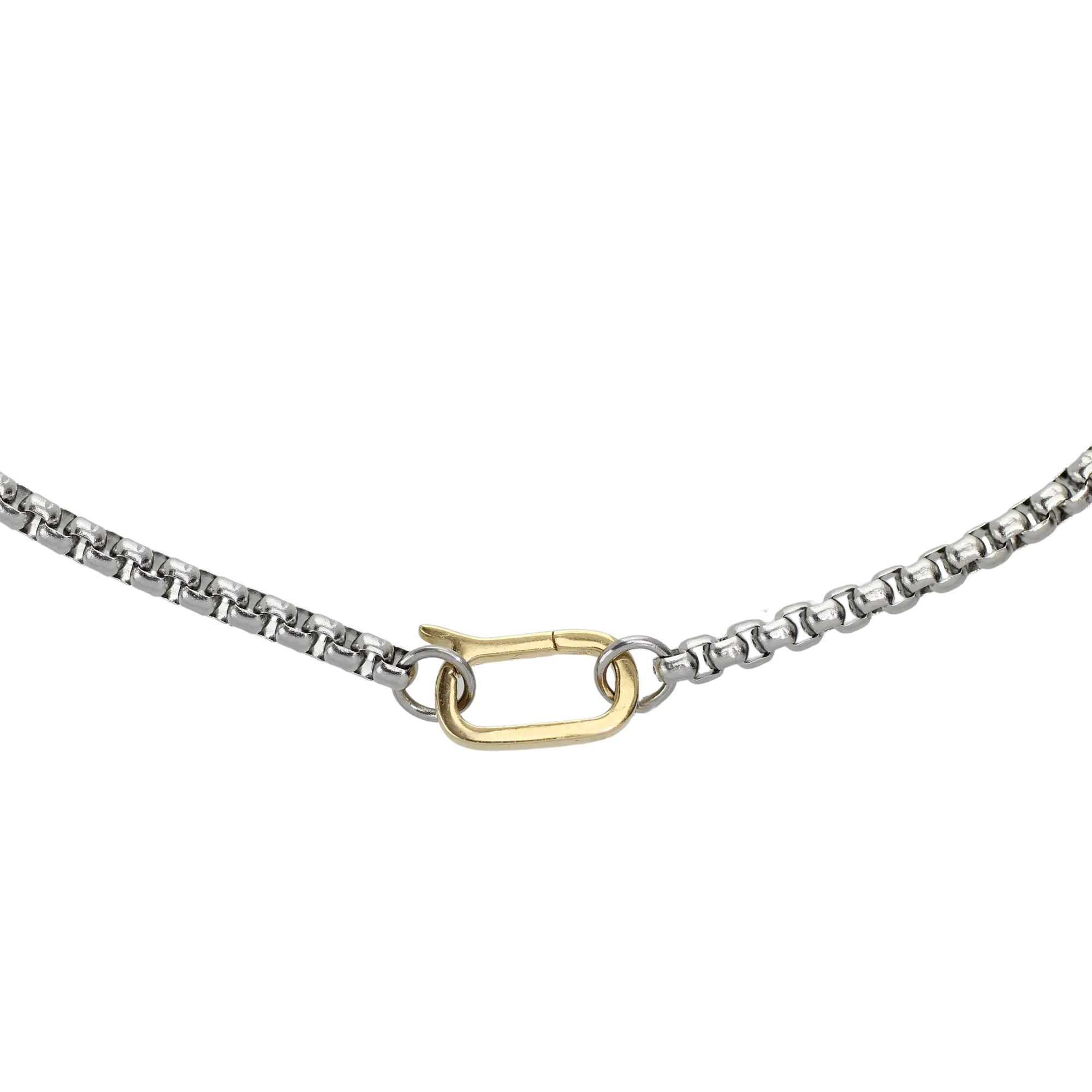 The "Regular Can Opener Chain" is a dainty thin stainless steel chain with a 925 sterling silver 18k gold plated clasp. Perfect for every day, its water resistant so no need to take it off.