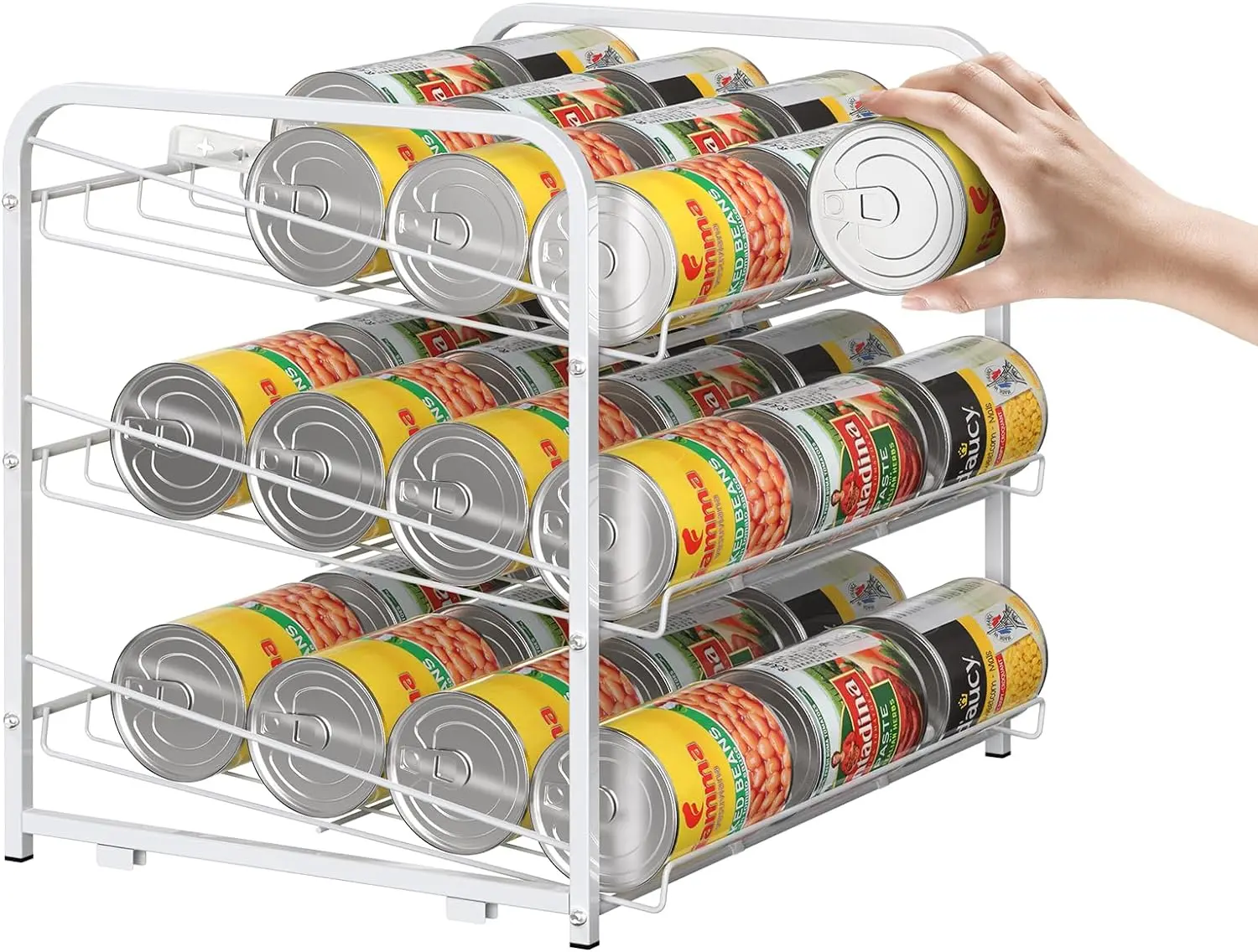 STABILITY CONSTRUCTION: This can organizer for pantry made of sturdy durable metal construction with white plating; pantry can organizer comes with rubber pads to prevent it from sliding or scratching the surface