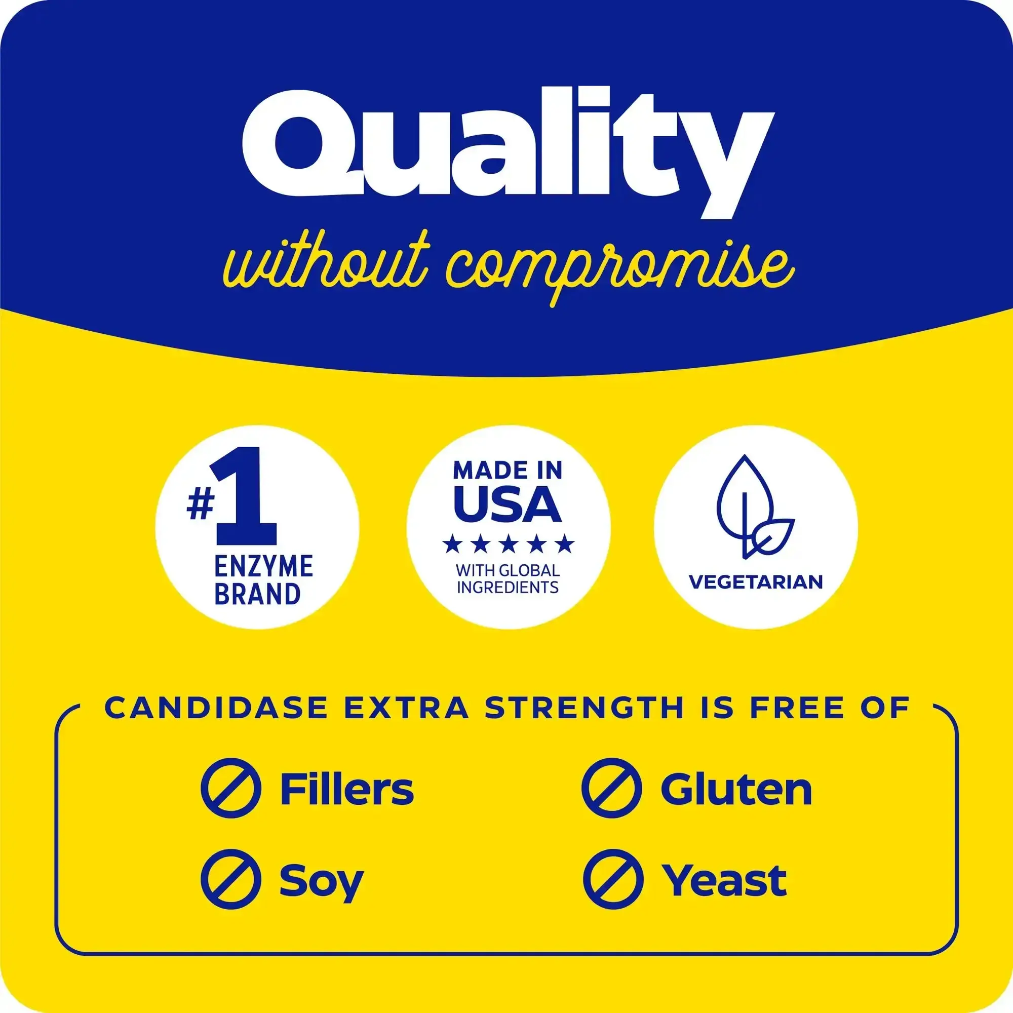 IngredientsPotassium (from Potassium Gluconate) 6 mg (<1%),Candidase® Extra Strength Blend 290 mg Garlic Powder (Allium sativum) (Bulb),Grape seed extract (Vitis vinifera),Lysozyme (from egg),Oregano Oil (Origanum vulgare),Thyme oil (Thymus vulgaris),Clove oil (Syzgium aromaticum),Peppermint extract (aerial),Bacillus subtilis (1 billion CFU),Hemicellulase 20000 HCU,Cellulase Thera-blend® 500 CU,Protease Thera-blend® 10000 HUT