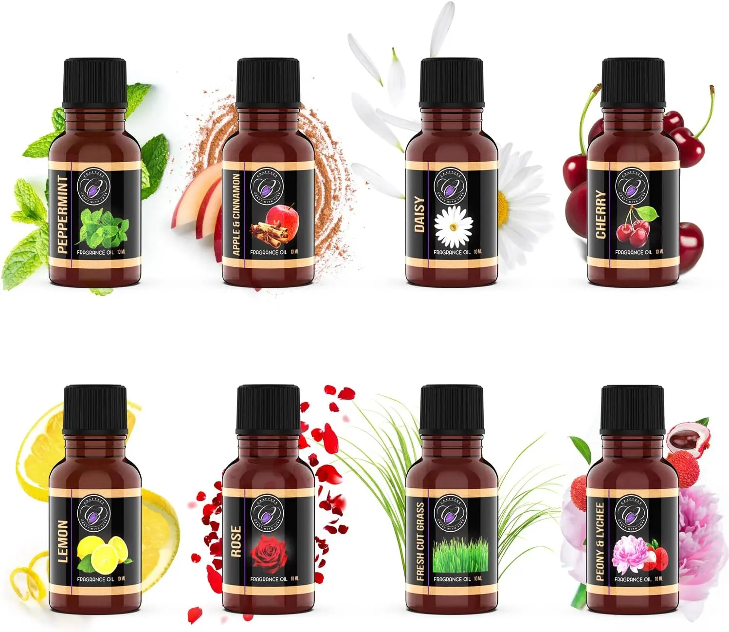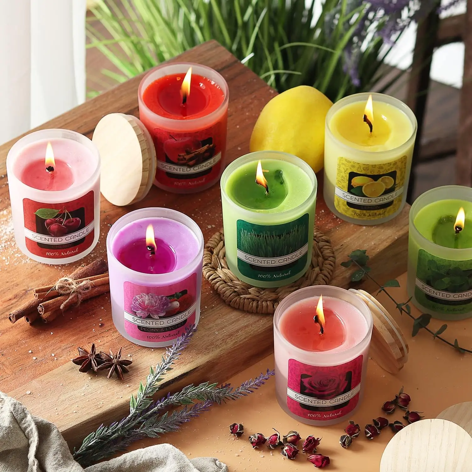 AROMATHERAPY: with soothing candle making scents : Peppermint, Apple & Cinnamon, Daisy, Cherry, Lemon, Peony & Lychee, Rose & Fresh Cut Grass. Have fun creating hues that suit your mood using the 8 colors of dye blocks.