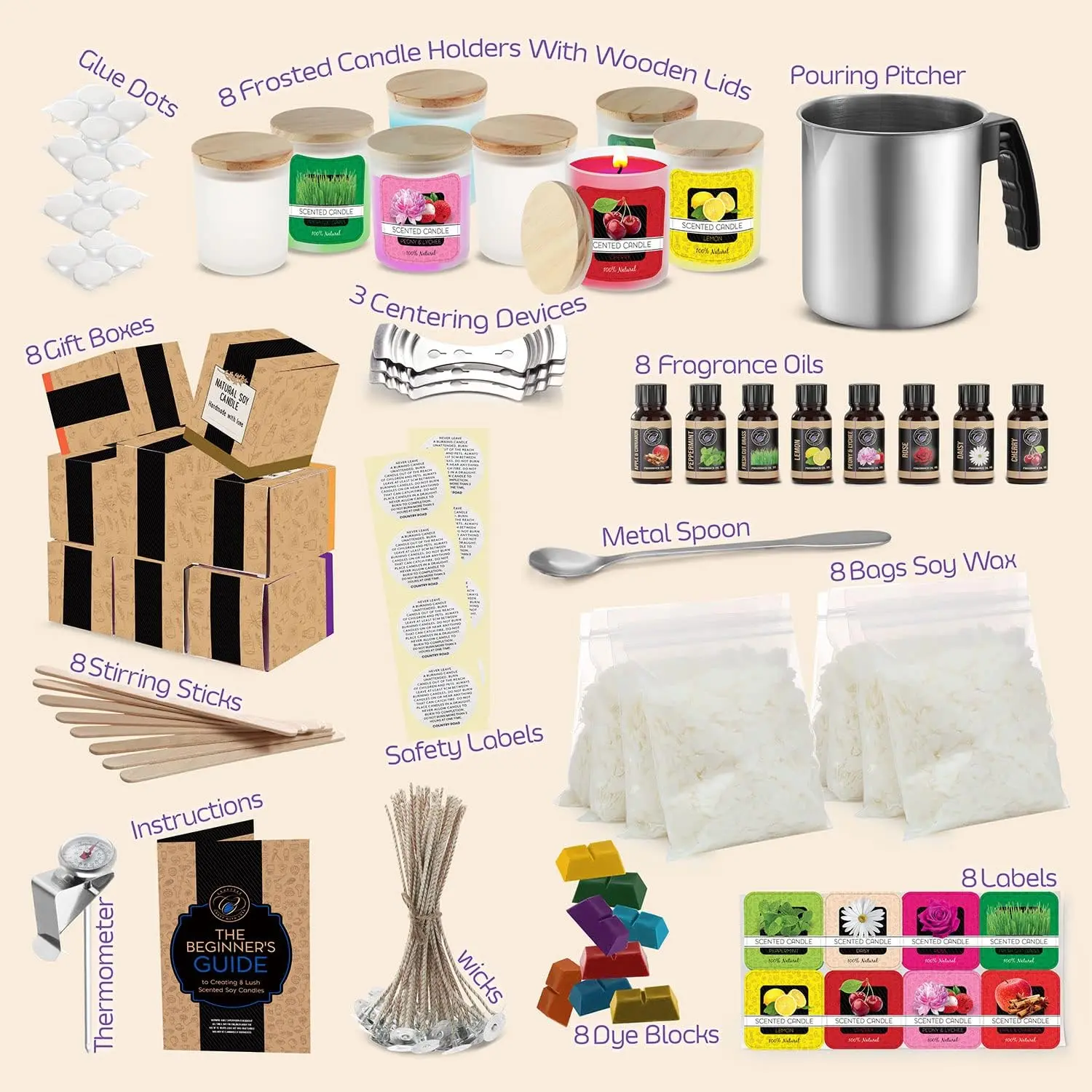 CANDLE KIT: includes 8 packs of 4 oz soy wax, 8 dye blocks, 8 fragrance oil (10ml), 1 melting pot, 1 stirring spoon, 1 thermometer, 8 frosted glass jars with wooden lids, cotton wicks, 16 glue dots, 8 sticker labels, 8 stirring sticks, 3 wick holders, 10 safety labels, 8 gift boxes & an instruction manual.