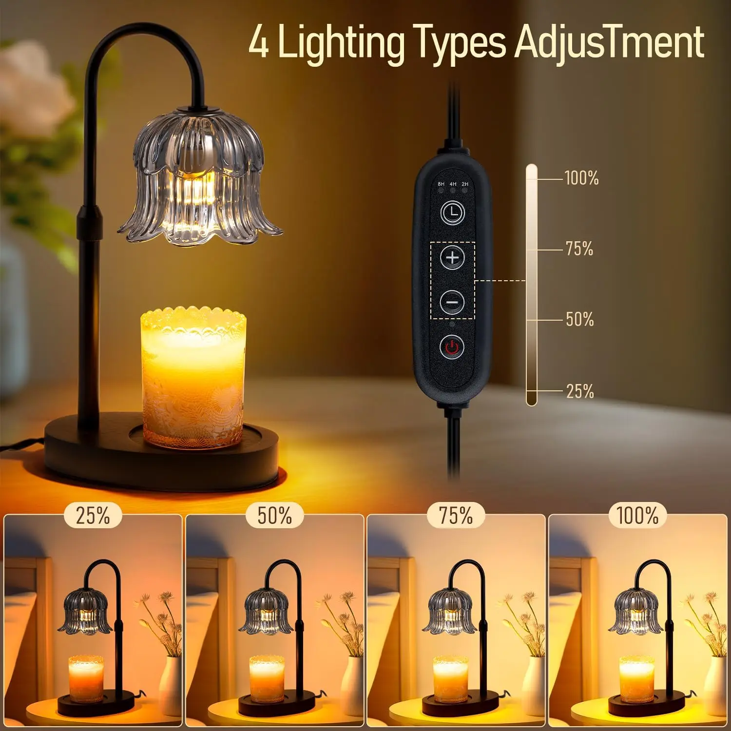 ·[DIMMABLE FUNCTION] 4 different brightness adjustments to meet different needs, according to the brightness of the light to determine the melting speed of the candles, so that the candles melt evenly to get the scent, allowing you to create the perfect atmosphere and the desired melting speed