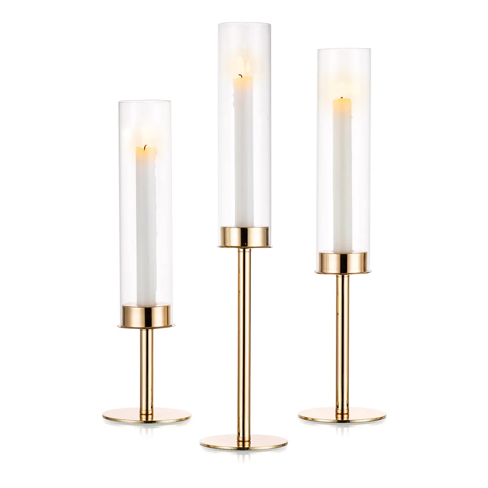 Hurricane Tall Candlestick Holders, Gold Metal Candle Holders Set of 3, Taper Candle Holders with Glass Cylinder Chimney, Long Skinny Candle Holders for Table Centerpiece Wedding 20’’22’’24’’