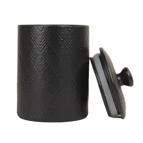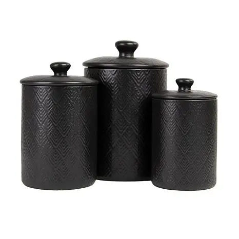 10 Strawberry Street Marquis Canister Set, Matte Black - 3 Piece  This posh set of canisters are embossed with a diamond texture and feature knobbed lids. Perfect for storing your countertop staples like flour, sugar, coffee or tea, while adding a stylish touch of décor to your kitchen. What You Get (1) 24 fl oz canister w/ lid (1) 38 fl oz canister w/ lid (1) 72 fl oz canister w/ lid